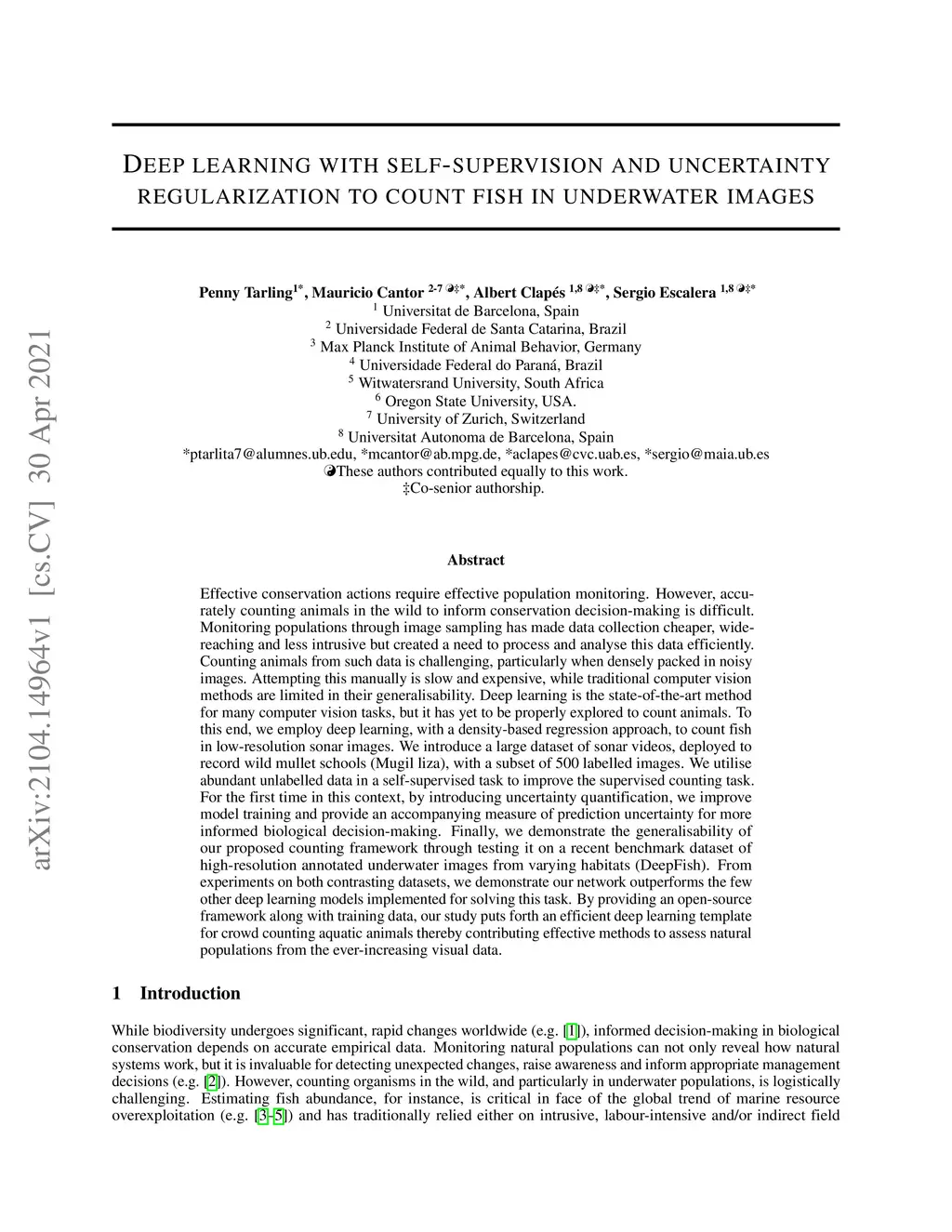 Effective conservation actions require effective population monitoring. However, accurately counting animals in the wild to inform conservation decision-making is difficult. Monitoring populations through image sampling has made data collection cheaper, wide-reaching and less intrusive but created a need to process and analyse this data efficiently. Counting animals from such data is challenging, particularly when densely packed in noisy images. Attempting this manually is slow and expensive, while traditional computer vision methods are limited in their generalisability. Deep learning is the state-of-the-art method for many computer vision tasks, but it has yet to be properly explored to count animals. To this end, we employ deep learning, with a density-based regression approach, to count fish in low-resolution sonar images. We introduce a large dataset of sonar videos, deployed to record wild mullet schools (Mugil liza), with a subset of 500 labelled images. We utilise abundant unlabelled data in a self-supervised task to improve the supervised counting task. For the first time in this context, by introducing uncertainty quantification, we improve model training and provide an accompanying measure of prediction uncertainty for more informed biological decision-making. Finally, we demonstrate the generalisability of our proposed counting framework through testing it on a recent benchmark dataset of high-resolution annotated underwater images from varying habitats (DeepFish). From experiments on both contrasting datasets, we demonstrate our network outperforms the few other deep learning models implemented for solving this task. By providing an open-source framework along with training data, our study puts forth an efficient deep learning template for crowd counting aquatic animals thereby contributing effective methods to assess natural populations from the ever-increasing visual data.