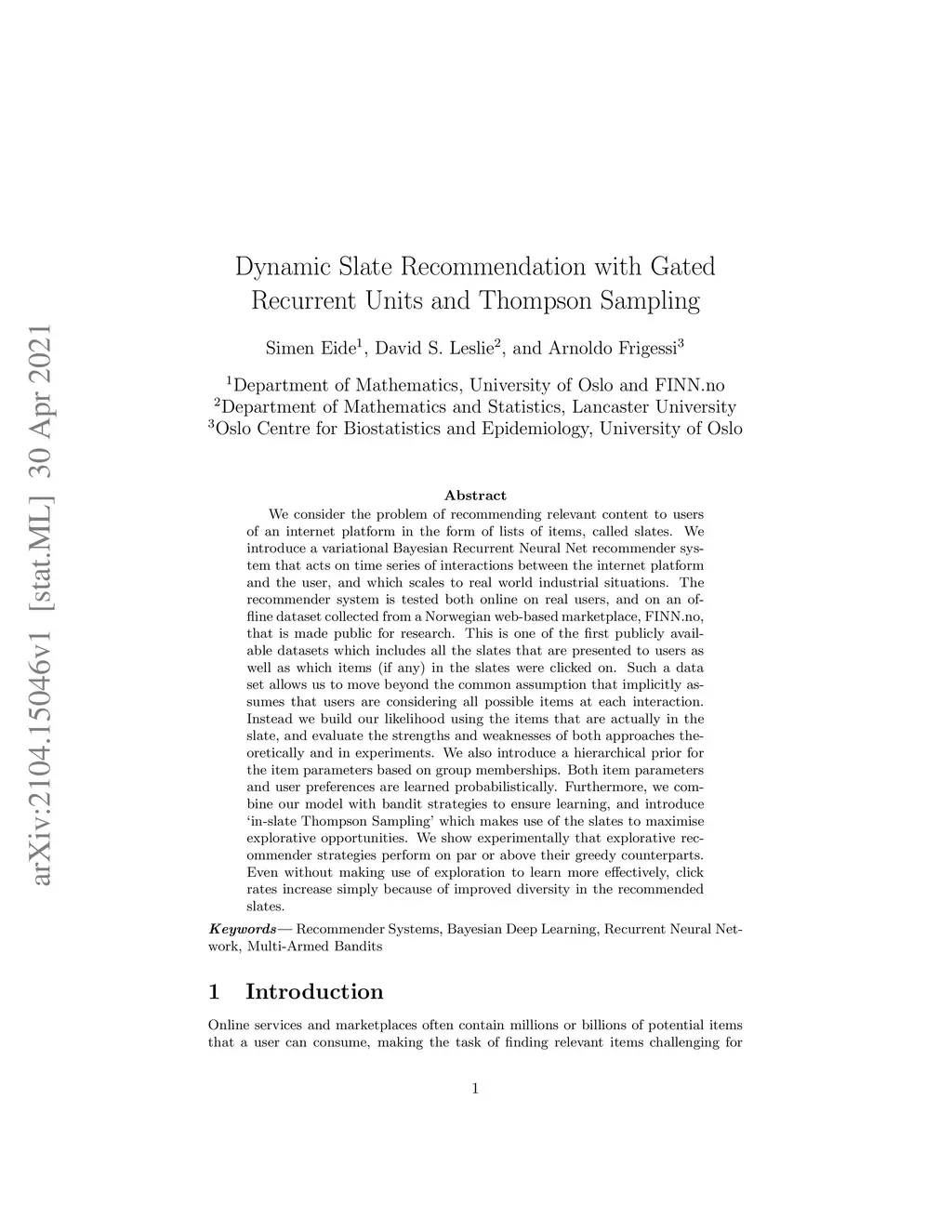 We consider the problem of recommending relevant content to users of an internet platform in the form of lists of items, called slates. We introduce a variational Bayesian Recurrent Neural Net recommender system that acts on time series of interactions between the internet platform and the user, and which scales to real world industrial situations. The recommender system is tested both online on real users, and on an offline dataset collected from a Norwegian web-based marketplace, FINN.no, that is made public for research. This is one of the first publicly available datasets which includes all the slates that are presented to users as well as which items (if any) in the slates were clicked on. Such a data set allows us to move beyond the common assumption that implicitly assumes that users are considering all possible items at each interaction. Instead we build our likelihood using the items that are actually in the slate, and evaluate the strengths and weaknesses of both approaches theoretically and in experiments. We also introduce a hierarchical prior for the item parameters based on group memberships. Both item parameters and user preferences are learned probabilistically. Furthermore, we combine our model with bandit strategies to ensure learning, and introduce `in-slate Thompson Sampling' which makes use of the slates to maximise explorative opportunities. We show experimentally that explorative recommender strategies perform on par or above their greedy counterparts. Even without making use of exploration to learn more effectively, click rates increase simply because of improved diversity in the recommended slates.