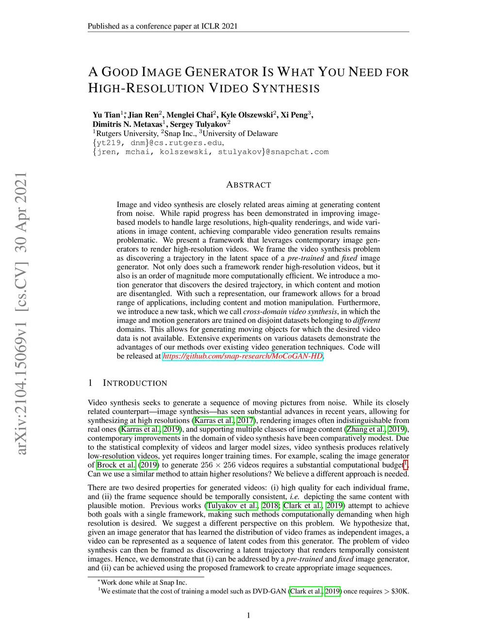 Image and video synthesis are closely related areas aiming at generating content from noise. While rapid progress has been demonstrated in improving image-based models to handle large resolutions, high-quality renderings, and wide variations in image content, achieving comparable video generation results remains problematic. We present a framework that leverages contemporary image generators to render high-resolution videos. We frame the video synthesis problem as discovering a trajectory in the latent space of a pre-trained and fixed image generator. Not only does such a framework render high-resolution videos, but it also is an order of magnitude more computationally efficient. We introduce a motion generator that discovers the desired trajectory, in which content and motion are disentangled. With such a representation, our framework allows for a broad range of applications, including content and motion manipulation. Furthermore, we introduce a new task, which we call cross-domain video synthesis, in which the image and motion generators are trained on disjoint datasets belonging to different domains. This allows for generating moving objects for which the desired video data is not available. Extensive experiments on various datasets demonstrate the advantages of our methods over existing video generation techniques. Code will be released at https://github.com/snap-research/MoCoGAN-HD.