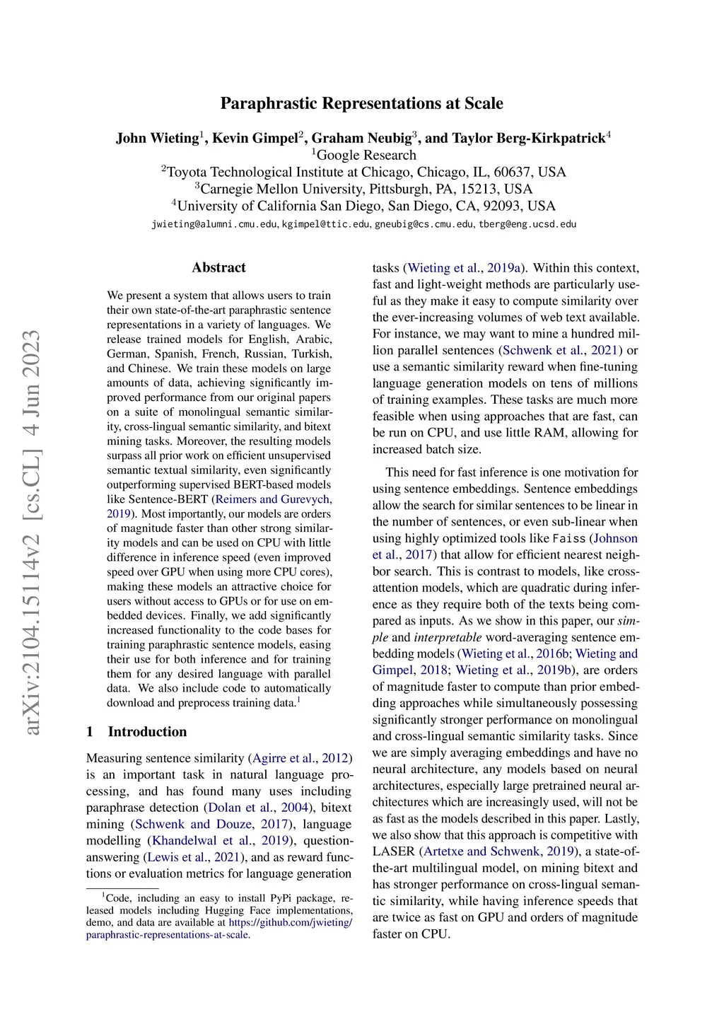 We present a system that allows users to train their own state-of-the-art paraphrastic sentence representations in a variety of languages. We also release trained models for English, Arabic, German, French, Spanish, Russian, Turkish, and Chinese. We train these models on large amounts of data, achieving significantly improved performance from the original papers proposing the methods on a suite of monolingual semantic similarity, cross-lingual semantic similarity, and bitext mining tasks. Moreover, the resulting models surpass all prior work on unsupervised semantic textual similarity, significantly outperforming even BERT-based models like Sentence-BERT (Reimers and Gurevych, 2019). Additionally, our models are orders of magnitude faster than prior work and can be used on CPU with little difference in inference speed (even improved speed over GPU when using more CPU cores), making these models an attractive choice for users without access to GPUs or for use on embedded devices. Finally, we add significantly increased functionality to the code bases for training paraphrastic sentence models, easing their use for both inference and for training them for any desired language with parallel data. We also include code to automatically download and preprocess training data.