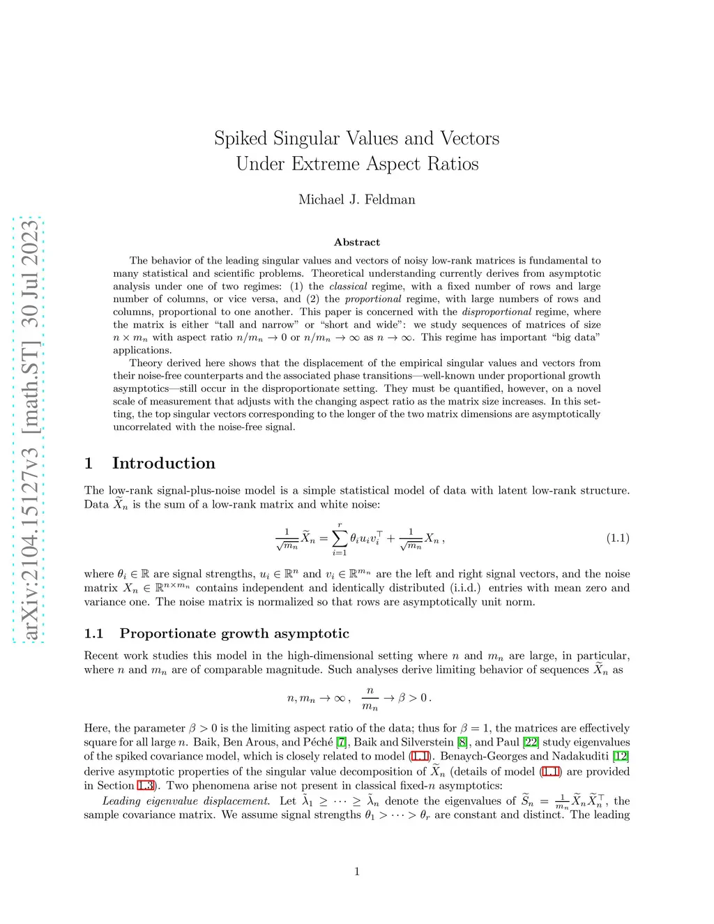 The behavior of the leading singular values and vectors of noisy low-rank matrices is fundamental to many statistical and scientific problems. Theoretical understanding currently derives from asymptotic analysis under one of two regimes: (1) the classical regime, with a fixed number of rows and large number of columns, or vice versa, and (2) the proportional regime, with large numbers of rows and columns, proportional to one another. This paper is concerned with the disproportional regime, where the matrix is either ``tall and narrow'' or ``short and wide'': we study sequences of matrices of size with aspect ratio $ n/m_n \rightarrow 0$ or as . This regime has important ``big data'' applications. Theory derived here shows that the displacement of the empirical singular values and vectors from their noise-free counterparts and the associated phase transitions -- well-known under proportional growth asymptotics -- still occur in the disproportionate setting. They must be quantified, however, on a novel scale of measurement that adjusts with the changing aspect ratio as the matrix size increases. In this setting, the top singular vectors corresponding to the longer of the two matrix dimensions are asymptotically uncorrelated with the noise-free signal.