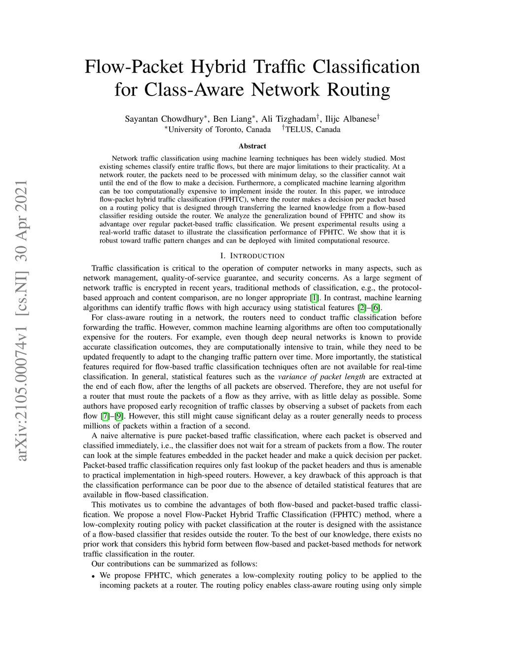 Network traffic classification using machine learning techniques has been widely studied. Most existing schemes classify entire traffic flows, but there are major limitations to their practicality. At a network router, the packets need to be processed with minimum delay, so the classifier cannot wait until the end of the flow to make a decision. Furthermore, a complicated machine learning algorithm can be too computationally expensive to implement inside the router. In this paper, we introduce flow-packet hybrid traffic classification (FPHTC), where the router makes a decision per packet based on a routing policy that is designed through transferring the learned knowledge from a flow-based classifier residing outside the router. We analyze the generalization bound of FPHTC and show its advantage over regular packet-based traffic classification. We present experimental results using a real-world traffic dataset to illustrate the classification performance of FPHTC. We show that it is robust toward traffic pattern changes and can be deployed with limited computational resource.