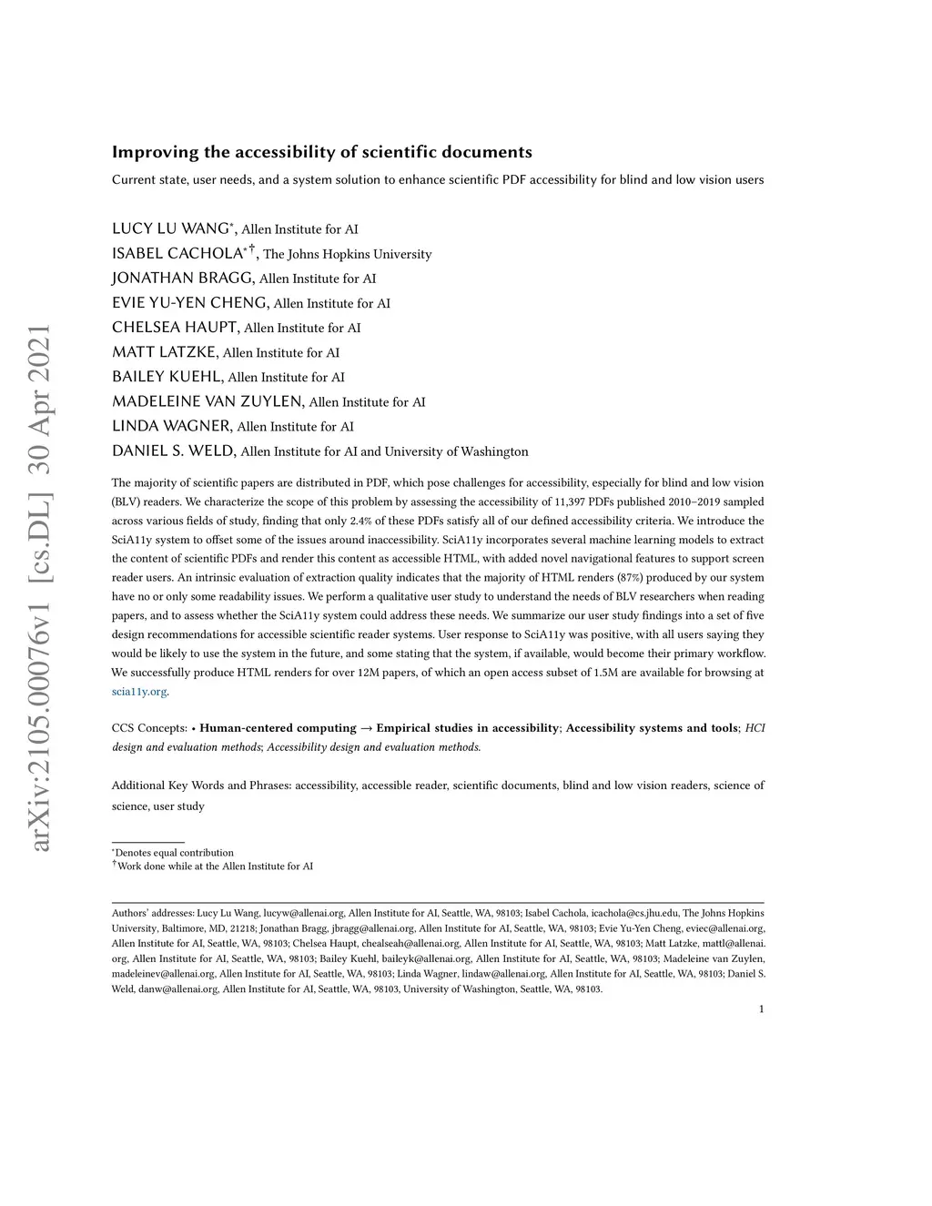 The majority of scientific papers are distributed in PDF, which pose challenges for accessibility, especially for blind and low vision (BLV) readers. We characterize the scope of this problem by assessing the accessibility of 11,397 PDFs published 2010--2019 sampled across various fields of study, finding that only 2.4% of these PDFs satisfy all of our defined accessibility criteria. We introduce the SciA11y system to offset some of the issues around inaccessibility. SciA11y incorporates several machine learning models to extract the content of scientific PDFs and render this content as accessible HTML, with added novel navigational features to support screen reader users. An intrinsic evaluation of extraction quality indicates that the majority of HTML renders (87%) produced by our system have no or only some readability issues. We perform a qualitative user study to understand the needs of BLV researchers when reading papers, and to assess whether the SciA11y system could address these needs. We summarize our user study findings into a set of five design recommendations for accessible scientific reader systems. User response to SciA11y was positive, with all users saying they would be likely to use the system in the future, and some stating that the system, if available, would become their primary workflow. We successfully produce HTML renders for over 12M papers, of which an open access subset of 1.5M are available for browsing at https://scia11y.org/