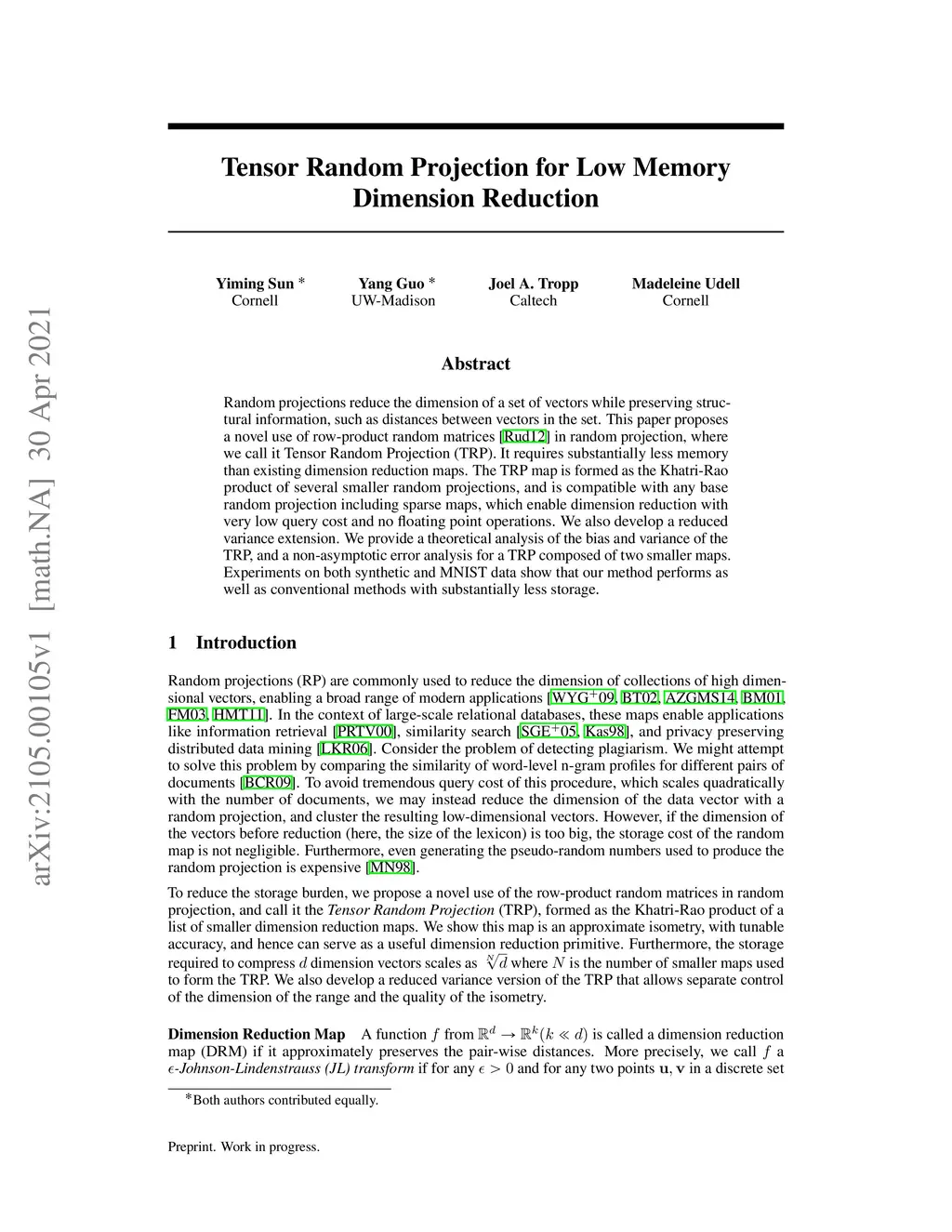 Random projections reduce the dimension of a set of vectors while preserving structural information, such as distances between vectors in the set. This paper proposes a novel use of row-product random matrices in random projection, where we call it Tensor Random Projection (TRP). It requires substantially less memory than existing dimension reduction maps. The TRP map is formed as the Khatri-Rao product of several smaller random projections, and is compatible with any base random projection including sparse maps, which enable dimension reduction with very low query cost and no floating point operations. We also develop a reduced variance extension. We provide a theoretical analysis of the bias and variance of the TRP, and a non-asymptotic error analysis for a TRP composed of two smaller maps. Experiments on both synthetic and MNIST data show that our method performs as well as conventional methods with substantially less storage.