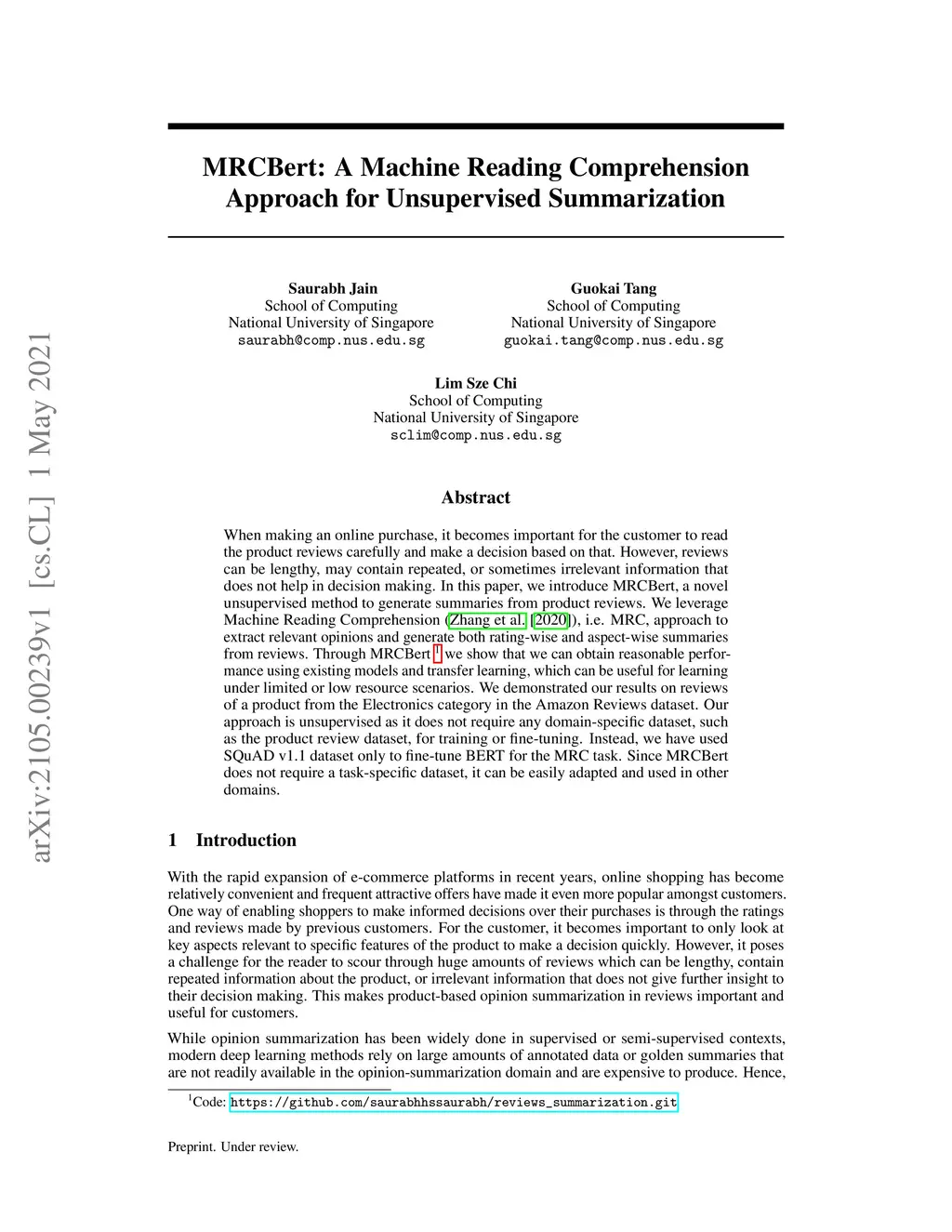 When making an online purchase, it becomes important for the customer to read the product reviews carefully and make a decision based on that. However, reviews can be lengthy, may contain repeated, or sometimes irrelevant information that does not help in decision making. In this paper, we introduce MRCBert, a novel unsupervised method to generate summaries from product reviews. We leverage Machine Reading Comprehension, i.e. MRC, approach to extract relevant opinions and generate both rating-wise and aspect-wise summaries from reviews. Through MRCBert we show that we can obtain reasonable performance using existing models and transfer learning, which can be useful for learning under limited or low resource scenarios. We demonstrated our results on reviews of a product from the Electronics category in the Amazon Reviews dataset. Our approach is unsupervised as it does not require any domain-specific dataset, such as the product review dataset, for training or fine-tuning. Instead, we have used SQuAD v1.1 dataset only to fine-tune BERT for the MRC task. Since MRCBert does not require a task-specific dataset, it can be easily adapted and used in other domains.