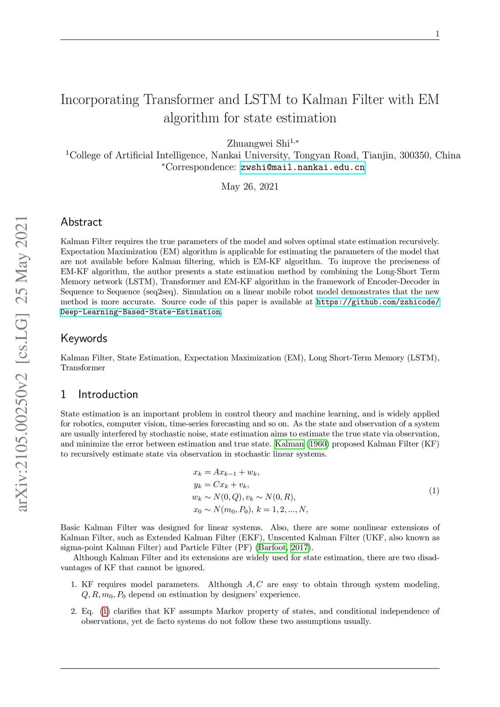 Kalman Filter requires the true parameters of the model and solves optimal state estimation recursively. Expectation Maximization (EM) algorithm is applicable for estimating the parameters of the model that are not available before Kalman filtering, which is EM-KF algorithm. To improve the preciseness of EM-KF algorithm, the author presents a state estimation method by combining the Long-Short Term Memory network (LSTM), Transformer and EM-KF algorithm in the framework of Encoder-Decoder in Sequence to Sequence (seq2seq). Simulation on a linear mobile robot model demonstrates that the new method is more accurate. Source code of this paper is available at https://github.com/zshicode/Deep-Learning-Based-State-Estimation.