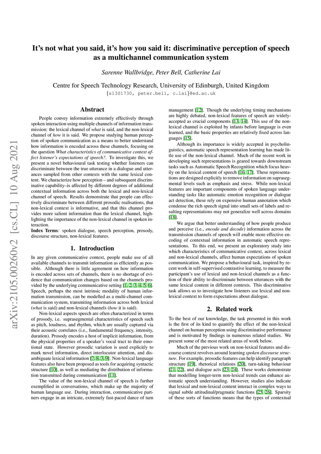 People convey information extremely effectively through spoken interaction using multiple channels of information transmission: the lexical channel of what is said, and the non-lexical channel of how it is said. We propose studying human perception of spoken communication as a means to better understand how information is encoded across these channels, focusing on the question 'What characteristics of communicative context affect listener's expectations of speech?'. To investigate this, we present a novel behavioural task testing whether listeners can discriminate between the true utterance in a dialogue and utterances sampled from other contexts with the same lexical content. We characterize how perception - and subsequent discriminative capability - is affected by different degrees of additional contextual information across both the lexical and non-lexical channel of speech. Results demonstrate that people can effectively discriminate between different prosodic realisations, that non-lexical context is informative, and that this channel provides more salient information than the lexical channel, highlighting the importance of the non-lexical channel in spoken interaction.