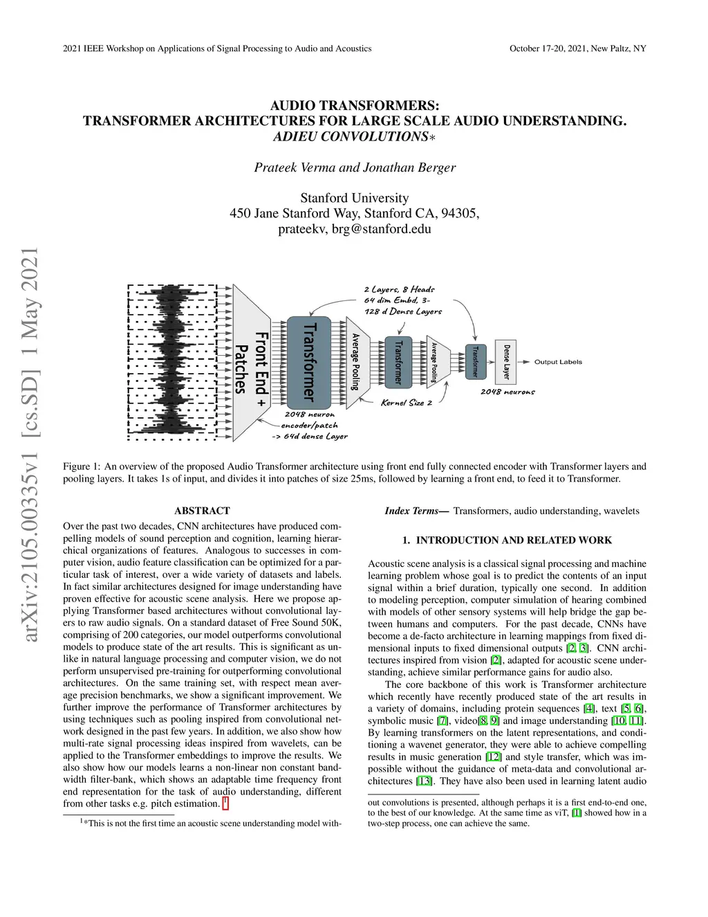 Over the past two decades, CNN architectures have produced compelling models of sound perception and cognition, learning hierarchical organizations of features. Analogous to successes in computer vision, audio feature classification can be optimized for a particular task of interest, over a wide variety of datasets and labels. In fact similar architectures designed for image understanding have proven effective for acoustic scene analysis. Here we propose applying Transformer based architectures without convolutional layers to raw audio signals. On a standard dataset of Free Sound 50K,comprising of 200 categories, our model outperforms convolutional models to produce state of the art results. This is significant as unlike in natural language processing and computer vision, we do not perform unsupervised pre-training for outperforming convolutional architectures. On the same training set, with respect mean aver-age precision benchmarks, we show a significant improvement. We further improve the performance of Transformer architectures by using techniques such as pooling inspired from convolutional net-work designed in the past few years. In addition, we also show how multi-rate signal processing ideas inspired from wavelets, can be applied to the Transformer embeddings to improve the results. We also show how our models learns a non-linear non constant band-width filter-bank, which shows an adaptable time frequency front end representation for the task of audio understanding, different from other tasks e.g. pitch estimation.