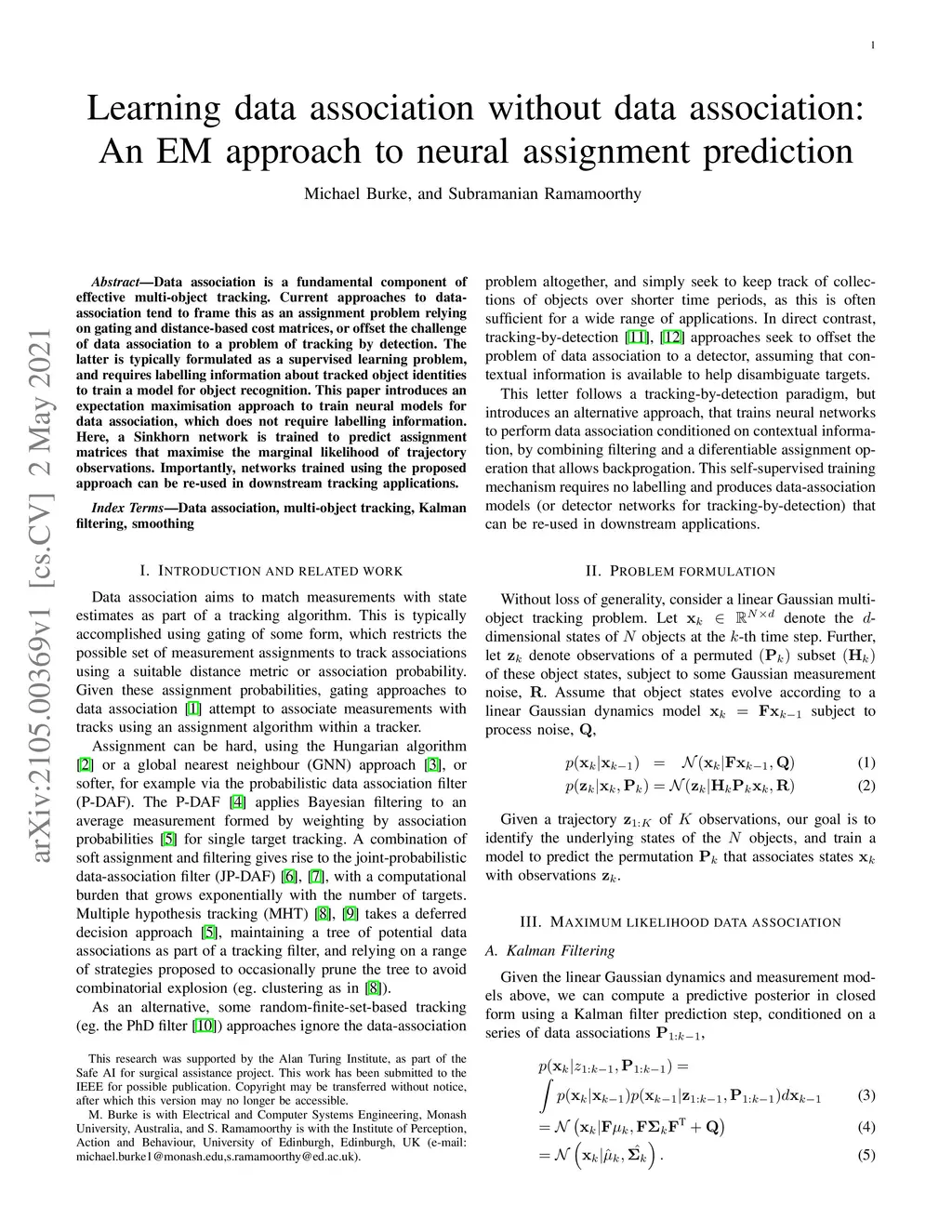 Data association is a fundamental component of effective multi-object tracking. Current approaches to data-association tend to frame this as an assignment problem relying on gating and distance-based cost matrices, or offset the challenge of data association to a problem of tracking by detection. The latter is typically formulated as a supervised learning problem, and requires labelling information about tracked object identities to train a model for object recognition. This paper introduces an expectation maximisation approach to train neural models for data association, which does not require labelling information. Here, a Sinkhorn network is trained to predict assignment matrices that maximise the marginal likelihood of trajectory observations. Importantly, networks trained using the proposed approach can be re-used in downstream tracking applications.