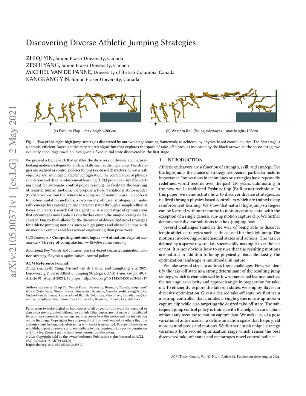 We present a framework that enables the discovery of diverse and natural-looking motion strategies for athletic skills such as the high jump. The strategies are realized as control policies for physics-based characters. Given a task objective and an initial character configuration, the combination of physics simulation and deep reinforcement learning (DRL) provides a suitable starting point for automatic control policy training. To facilitate the learning of realistic human motions, we propose a Pose Variational Autoencoder (P-VAE) to constrain the actions to a subspace of natural poses. In contrast to motion imitation methods, a rich variety of novel strategies can naturally emerge by exploring initial character states through a sample-efficient Bayesian diversity search (BDS) algorithm. A second stage of optimization that encourages novel policies can further enrich the unique strategies discovered. Our method allows for the discovery of diverse and novel strategies for athletic jumping motions such as high jumps and obstacle jumps with no motion examples and less reward engineering than prior work.