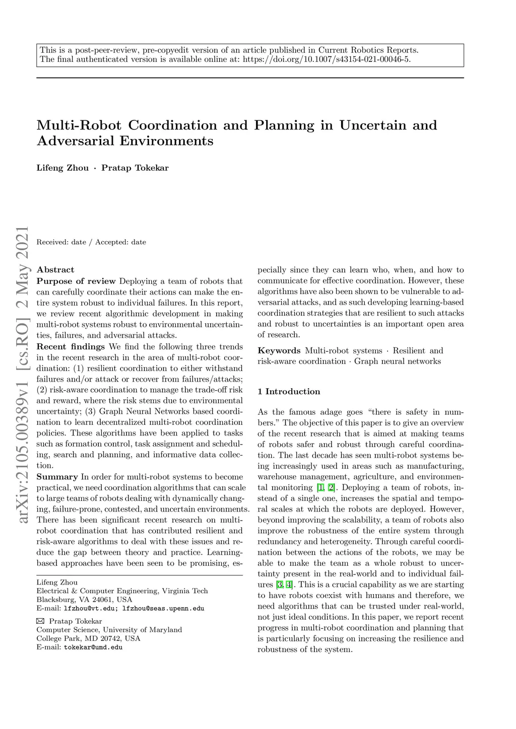 Deploying a team of robots that can carefully coordinate their actions can make the entire system robust to individual failures. In this report, we review recent algorithmic development in making multi-robot systems robust to environmental uncertainties, failures, and adversarial attacks. We find the following three trends in the recent research in the area of multi-robot coordination: (1) resilient coordination to either withstand failures and/or attack or recover from failures/attacks; (2) risk-aware coordination to manage the trade-off risk and reward, where the risk stems due to environmental uncertainty; (3) Graph Neural Networks based coordination to learn decentralized multi-robot coordination policies. These algorithms have been applied to tasks such as formation control, task assignment and scheduling, search and planning, and informative data collection. In order for multi-robot systems to become practical, we need coordination algorithms that can scale to large teams of robots dealing with dynamically changing, failure-prone, contested, and uncertain environments. There has been significant recent research on multi-robot coordination that has contributed resilient and risk-aware algorithms to deal with these issues and reduce the gap between theory and practice. Learning-based approaches have been seen to be promising, especially since they can learn who, when, and how to communicate for effective coordination. However, these algorithms have also been shown to be vulnerable to adversarial attacks, and as such developing learning-based coordination strategies that are resilient to such attacks and robust to uncertainties is an important open area of research.