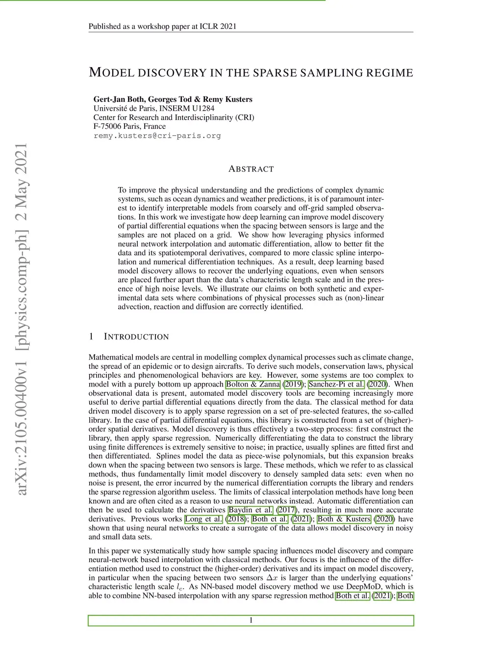 To improve the physical understanding and the predictions of complex dynamic systems, such as ocean dynamics and weather predictions, it is of paramount interest to identify interpretable models from coarsely and off-grid sampled observations. In this work, we investigate how deep learning can improve model discovery of partial differential equations when the spacing between sensors is large and the samples are not placed on a grid. We show how leveraging physics informed neural network interpolation and automatic differentiation, allow to better fit the data and its spatiotemporal derivatives, compared to more classic spline interpolation and numerical differentiation techniques. As a result, deep learning-based model discovery allows to recover the underlying equations, even when sensors are placed further apart than the data's characteristic length scale and in the presence of high noise levels. We illustrate our claims on both synthetic and experimental data sets where combinations of physical processes such as (non)-linear advection, reaction, and diffusion are correctly identified.