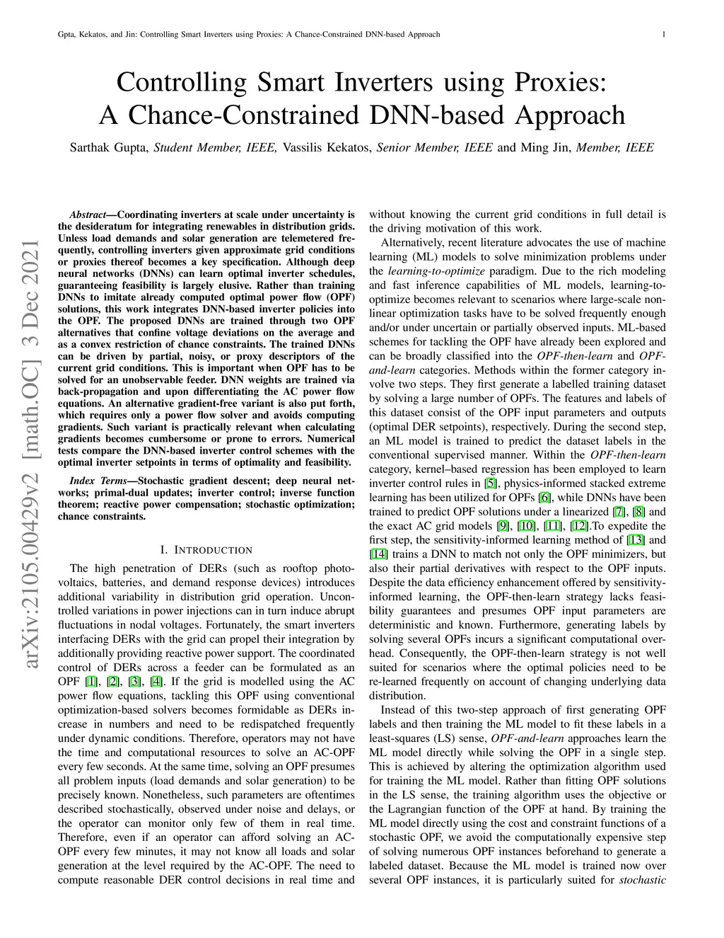 Coordinating inverters at scale under uncertainty is the desideratum for integrating renewables in distribution grids. Unless load demands and solar generation are telemetered frequently, controlling inverters given approximate grid conditions or proxies thereof becomes a key specification. Although deep neural networks (DNNs) can learn optimal inverter schedules, guaranteeing feasibility is largely elusive. Rather than training DNNs to imitate already computed optimal power flow (OPF) solutions, this work integrates DNN-based inverter policies into the OPF. The proposed DNNs are trained through two OPF alternatives that confine voltage deviations on the average and as a convex restriction of chance constraints. The trained DNNs can be driven by partial, noisy, or proxy descriptors of the current grid conditions. This is important when OPF has to be solved for an unobservable feeder. DNN weights are trained via back-propagation and upon differentiating the AC power flow equations assuming the network model is known. Otherwise, a gradient-free variant is put forth. The latter is relevant when inverters are controlled by an aggregator having access only to a power flow solver or a digital twin of the feeder. Numerical tests compare the DNN-based inverter control schemes with the optimal inverter setpoints in terms of optimality and feasibility.