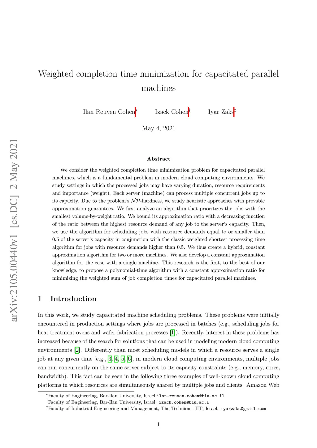 We consider the weighted completion time minimization problem for capacitated parallel machines, which is a fundamental problem in modern cloud computing environments. We study settings in which the processed jobs may have varying duration, resource requirements and importance (weight). Each server (machine) can process multiple concurrent jobs up to its capacity. Due to the problem's -hardness, we study heuristic approaches with provable approximation guarantees. We first analyze an algorithm that prioritizes the jobs with the smallest volume-by-weight ratio. We bound its approximation ratio with a decreasing function of the ratio between the highest resource demand of any job to the server's capacity. Then, we use the algorithm for scheduling jobs with resource demands equal to or smaller than 0.5 of the server's capacity in conjunction with the classic weighted shortest processing time algorithm for jobs with resource demands higher than 0.5. We thus create a hybrid, constant approximation algorithm for two or more machines. We also develop a constant approximation algorithm for the case with a single machine. This research is the first, to the best of our knowledge, to propose a polynomial-time algorithm with a constant approximation ratio for minimizing the weighted sum of job completion times for capacitated parallel machines.
