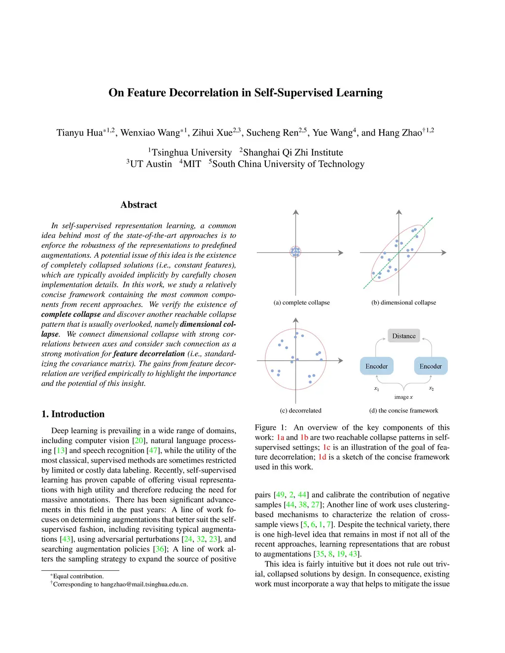In self-supervised representation learning, a common idea behind most of the state-of-the-art approaches is to enforce the robustness of the representations to predefined augmentations. A potential issue of this idea is the existence of completely collapsed solutions (i.e., constant features), which are typically avoided implicitly by carefully chosen implementation details. In this work, we study a relatively concise framework containing the most common components from recent approaches. We verify the existence of complete collapse and discover another reachable collapse pattern that is usually overlooked, namely dimensional collapse. We connect dimensional collapse with strong correlations between axes and consider such connection as a strong motivation for feature decorrelation (i.e., standardizing the covariance matrix). The gains from feature decorrelation are verified empirically to highlight the importance and the potential of this insight.