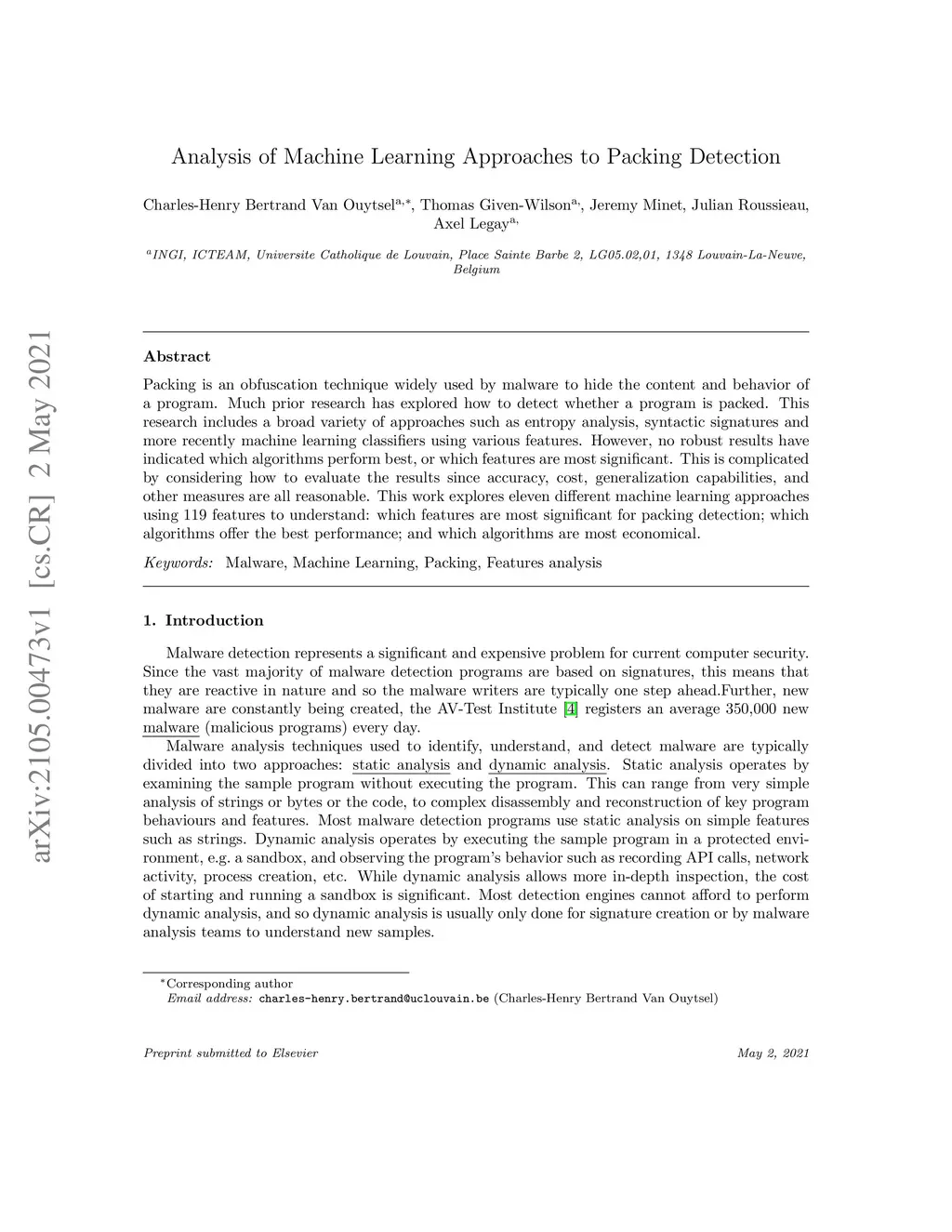Packing is an obfuscation technique widely used by malware to hide the content and behavior of a program. Much prior research has explored how to detect whether a program is packed. This research includes a broad variety of approaches such as entropy analysis, syntactic signatures and more recently machine learning classifiers using various features. However, no robust results have indicated which algorithms perform best, or which features are most significant. This is complicated by considering how to evaluate the results since accuracy, cost, generalization capabilities, and other measures are all reasonable. This work explores eleven different machine learning approaches using 119 features to understand: which features are most significant for packing detection; which algorithms offer the best performance; and which algorithms are most economical.