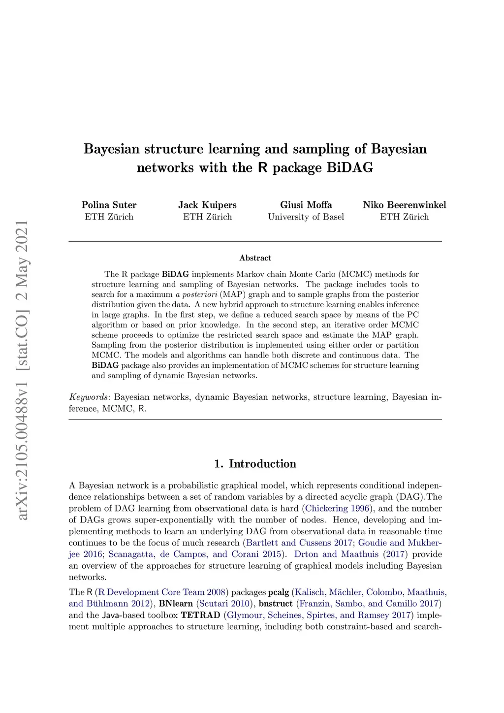 The R package BiDAG implements Markov chain Monte Carlo (MCMC) methods for structure learning and sampling of Bayesian networks. The package includes tools to search for a maximum a posteriori (MAP) graph and to sample graphs from the posterior distribution given the data. A new hybrid approach to structure learning enables inference in large graphs. In the first step, we define a reduced search space by means of the PC algorithm or based on prior knowledge. In the second step, an iterative order MCMC scheme proceeds to optimize within the restricted search space and estimate the MAP graph. Sampling from the posterior distribution is implemented using either order or partition MCMC. The models and algorithms can handle both discrete and continuous data. The BiDAG package also provides an implementation of MCMC schemes for structure learning and sampling of dynamic Bayesian networks.