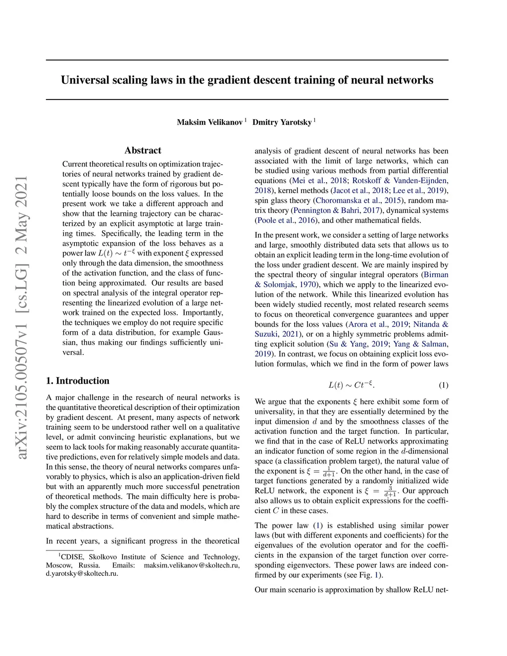 Current theoretical results on optimization trajectories of neural networks trained by gradient descent typically have the form of rigorous but potentially loose bounds on the loss values. In the present work we take a different approach and show that the learning trajectory can be characterized by an explicit asymptotic at large training times. Specifically, the leading term in the asymptotic expansion of the loss behaves as a power law with exponent expressed only through the data dimension, the smoothness of the activation function, and the class of function being approximated. Our results are based on spectral analysis of the integral operator representing the linearized evolution of a large network trained on the expected loss. Importantly, the techniques we employ do not require specific form of a data distribution, for example Gaussian, thus making our findings sufficiently universal.
