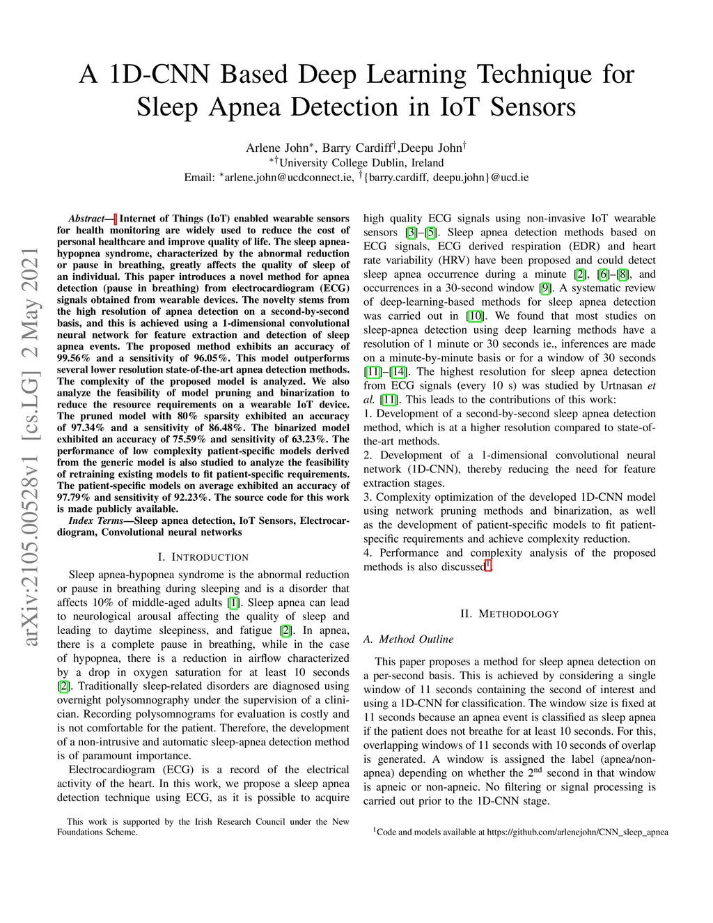 A 1D-CNN Based Deep Learning Technique for Sleep Apnea Detection in IoT