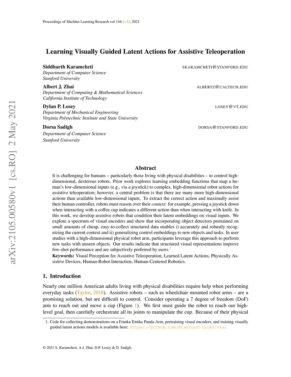 Learning Visually Guided Latent Actions for Assistive Teleoperation