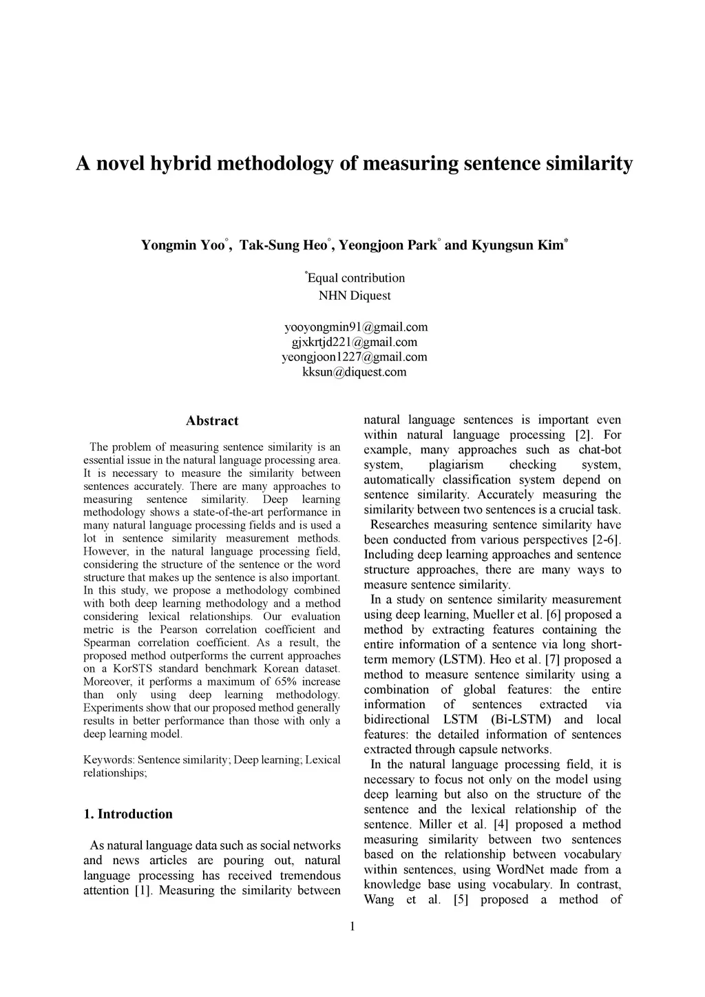 The problem of measuring sentence similarity is an essential issue in the natural language processing (NLP) area. It is necessary to measure the similarity between sentences accurately. There are many approaches to measuring sentence similarity. Deep learning methodology shows a state-of-the-art performance in many natural language processing fields and is used a lot in sentence similarity measurement methods. However, in the natural language processing field, considering the structure of the sentence or the word structure that makes up the sentence is also important. In this study, we propose a methodology combined with both deep learning methodology and a method considering lexical relationships. Our evaluation metric is the Pearson correlation coefficient and Spearman correlation coefficient. As a result, the proposed method outperforms the current approaches on a KorSTS standard benchmark Korean dataset. Moreover, it performs a maximum of 65% increase than only using deep learning methodology. Experiments show that our proposed method generally results in better performance than those with only a deep learning model.