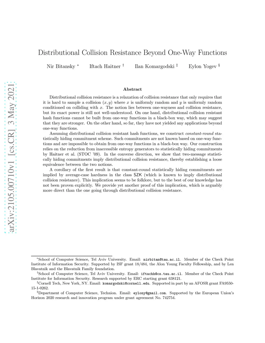 Distributional Collision Resistance Beyond One-Way Functions