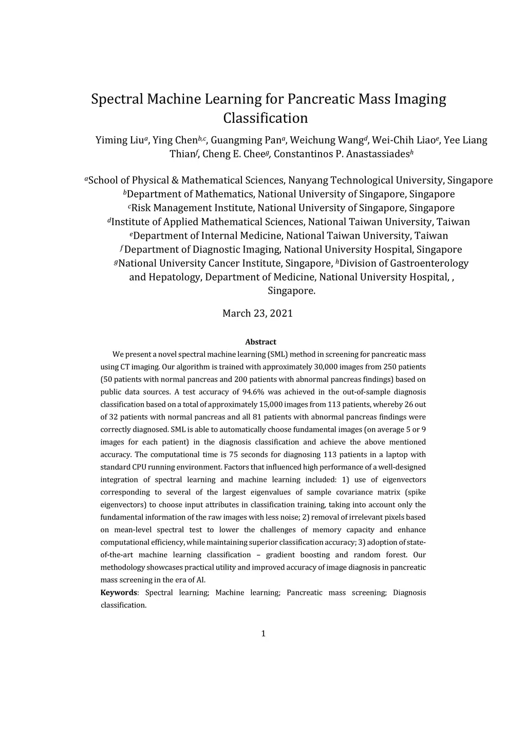 Spectral Machine Learning for Pancreatic Mass Imaging Classification