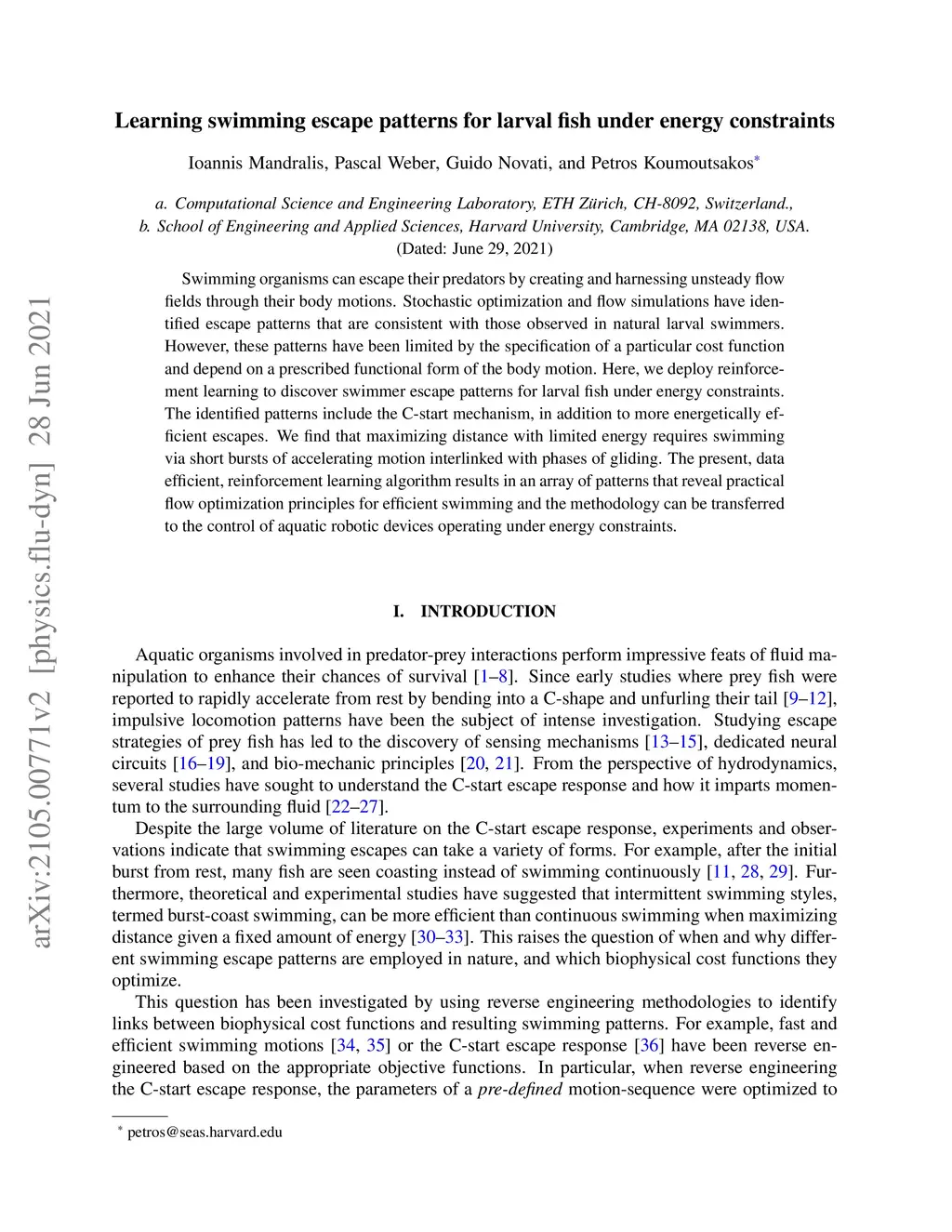 Swimming organisms can escape their predators by creating and harnessing unsteady flow fields through their body motions. Stochastic optimization and flow simulations have identified escape patterns that are consistent with those observed in natural larval swimmers. However, these patterns have been limited by the specification of a particular cost function and depend on a prescribed functional form of the body motion. Here, we deploy reinforcement learning to discover swimmer escape patterns for larval fish under energy constraints. The identified patterns include the C-start mechanism, in addition to more energetically efficient escapes. We find that maximizing distance with limited energy requires swimming via short bursts of accelerating motion interlinked with phases of gliding. The present, data efficient, reinforcement learning algorithm results in an array of patterns that reveal practical flow optimization principles for efficient swimming and the methodology can be transferred to the control of aquatic robotic devices operating under energy constraints.