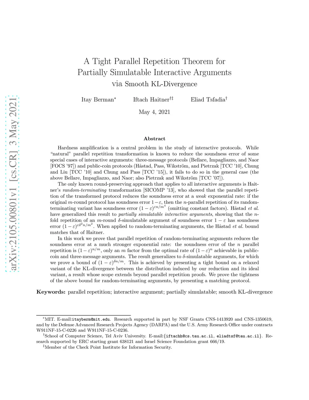 Hardness amplification is a central problem in the study of interactive protocols. While ``natural'' parallel repetition transformation is known to reduce the soundness error of some special cases of interactive arguments: three-message protocols and public-coin protocols, it fails to do so in the general case. The only known round-preserving approach that applies to all interactive arguments is Haitner's random-terminating transformation [SICOMP '13], who showed that the parallel repetition of the transformed protocol reduces the soundness error at a weak exponential rate: if the original -round protocol has soundness error , then the -parallel repetition of its random-terminating variant has soundness error (omitting constant factors). Hastad et al. [TCC '10] have generalized this result to partially simulatable interactive arguments, showing that the -fold repetition of an -round -simulatable argument of soundness error has soundness error . When applied to random-terminating arguments, the Hastad et al. bound matches that of Haitner. In this work we prove that parallel repetition of random-terminating arguments reduces the soundness error at a much stronger exponential rate: the soundness error of the parallel repetition is , only an factor from the optimal rate of achievable in public-coin and three-message arguments. The result generalizes to -simulatable arguments, for which we prove a bound of . This is achieved by presenting a tight bound on a relaxed variant of the KL-divergence between the distribution induced by our reduction and its ideal variant, a result whose scope extends beyond parallel repetition proofs. We prove the tightness of the above bound for random-terminating arguments, by presenting a matching protocol.