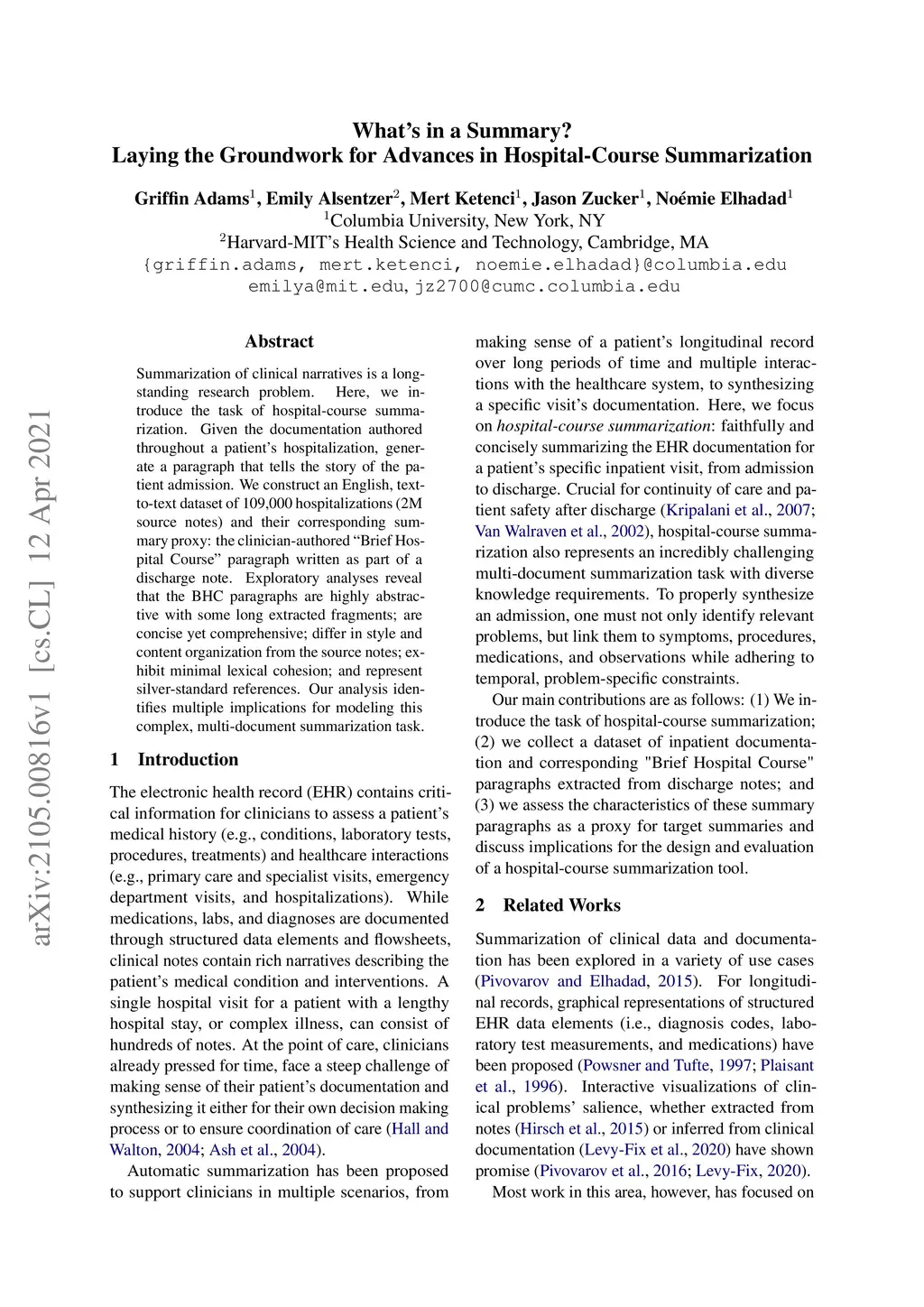 Summarization of clinical narratives is a long-standing research problem. Here, we introduce the task of hospital-course summarization. Given the documentation authored throughout a patient's hospitalization, generate a paragraph that tells the story of the patient admission. We construct an English, text-to-text dataset of 109,000 hospitalizations (2M source notes) and their corresponding summary proxy: the clinician-authored "Brief Hospital Course" paragraph written as part of a discharge note. Exploratory analyses reveal that the BHC paragraphs are highly abstractive with some long extracted fragments; are concise yet comprehensive; differ in style and content organization from the source notes; exhibit minimal lexical cohesion; and represent silver-standard references. Our analysis identifies multiple implications for modeling this complex, multi-document summarization task.