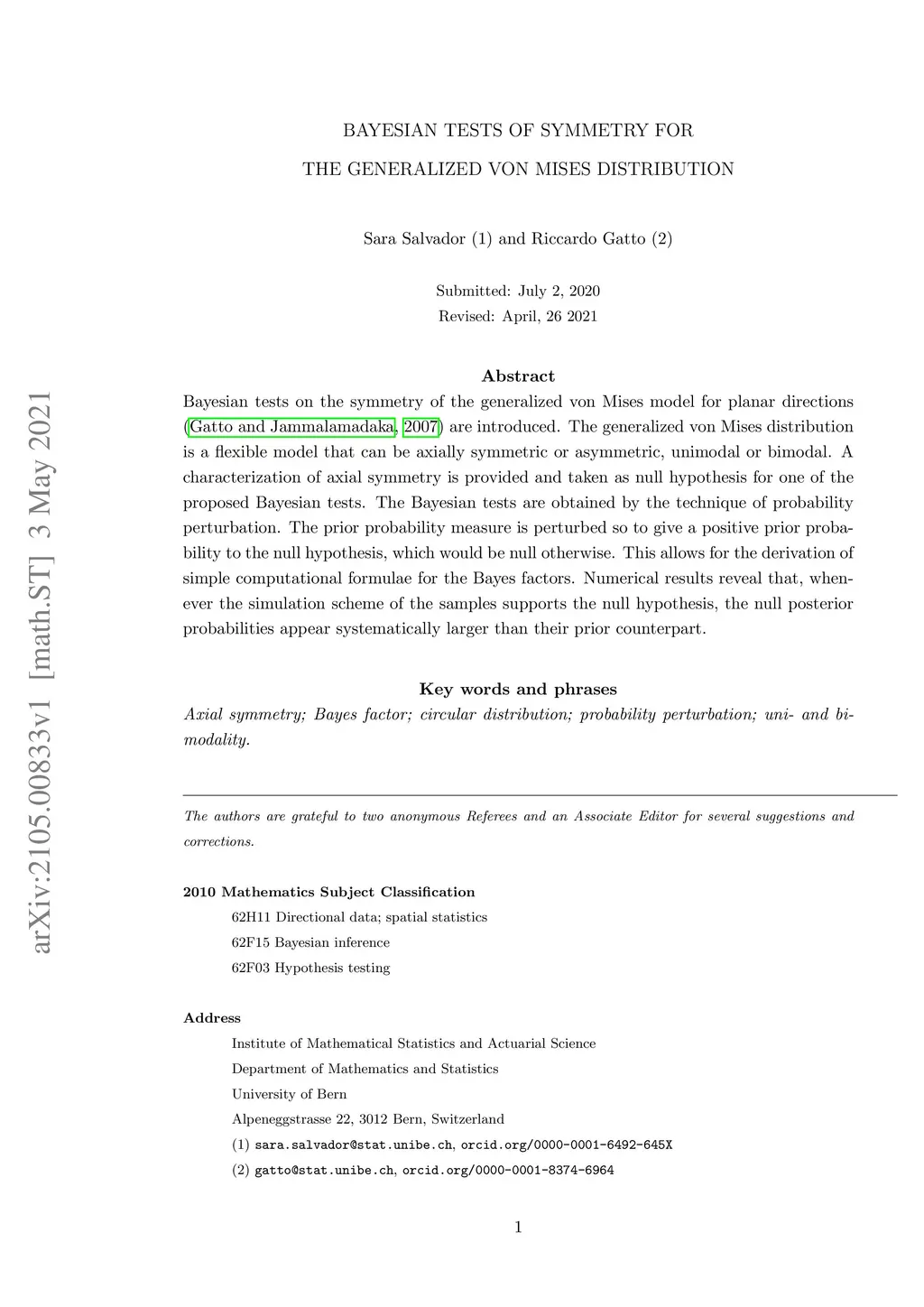 Bayesian tests on the symmetry of the generalized von Mises model for planar directions (Gatto and Jammalamadaka, 2007) are introduced. The generalized von Mises distribution is a flexible model that can be axially symmetric or asymmetric, unimodal or bimodal. A characterization of axial symmetry is provided and taken as null hypothesis for one of the proposed Bayesian tests. The Bayesian tests are obtained by the technique of probability perturbation. The prior probability measure is perturbed so to give a positive prior probability to the null hypothesis, which would be null otherwise. This allows for the derivation of simple computational formulae for the Bayes factors. Numerical results reveal that, whenever the simulation scheme of the samples supports the null hypothesis, the null posterior probabilities appear systematically larger than their prior counterpart.