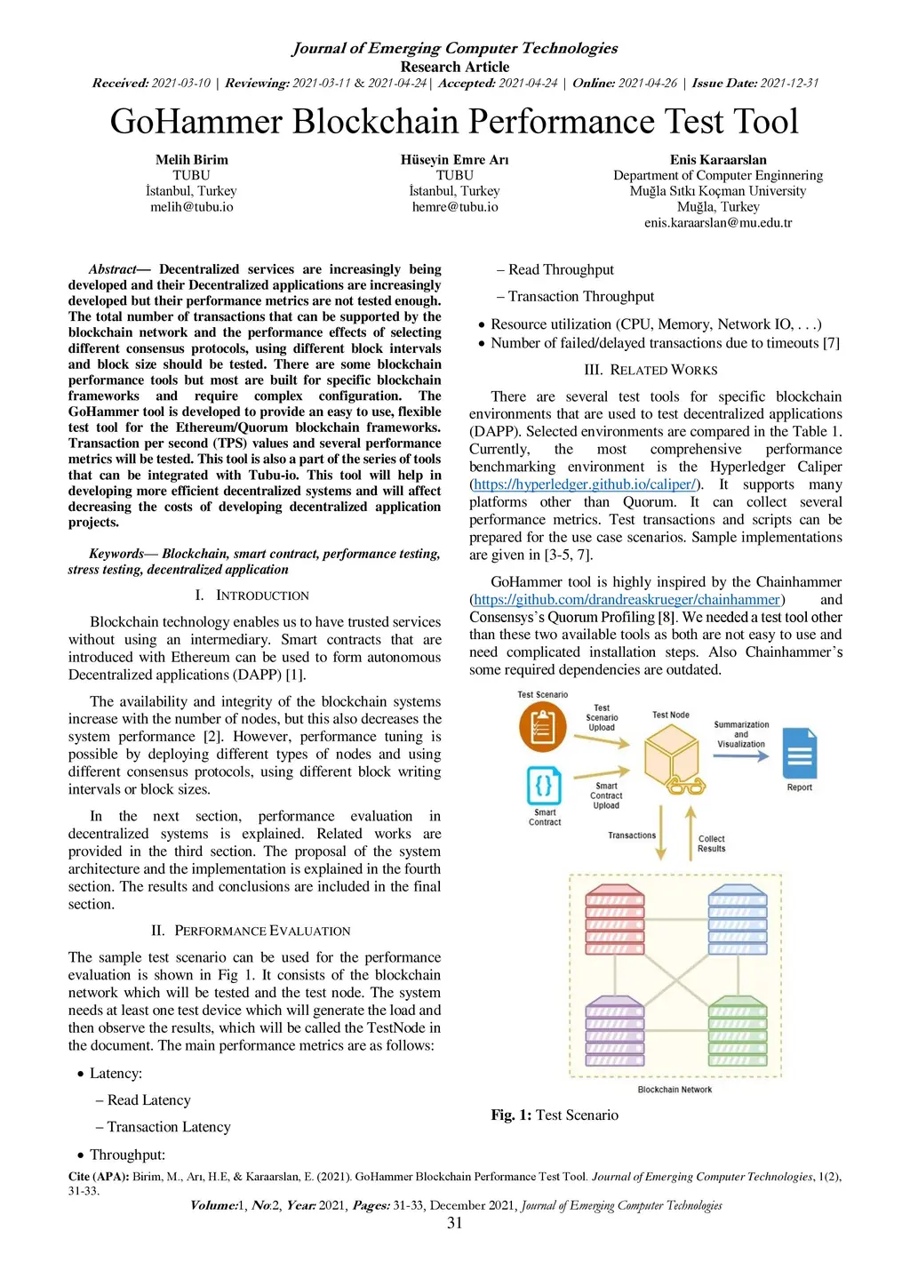 Decentralized services are increasingly being developed and their Decentralized applications are increasingly developed but their performance metrics are not tested enough. The total number of transactions that can be supported by the blockchain network and the performance effects of selecting different consensus protocols, using different block intervals and block size should be tested. There are some blockchain performance tools but most are built for specific blockchain frameworks and require complex configuration. The GoHammer tool is developed to provide an easy to use, flexible test tool for the Ethereum/Quorum blockchain frameworks. Transaction per second (TPS) values and several performance metrics will be tested. This tool is also a part of the series of tools that can be integrated with Tubu-io. This tool will help in developing more efficient decentralized systems and will affect decreasing the costs of developing decentralized application projects.