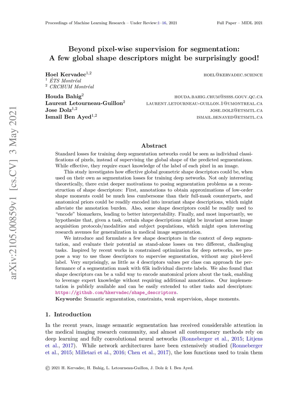 Standard losses for training deep segmentation networks could be seen as individual classifications of pixels, instead of supervising the global shape of the predicted segmentations. While effective, they require exact knowledge of the label of each pixel in an image. This study investigates how effective global geometric shape descriptors could be, when used on their own as segmentation losses for training deep networks. Not only interesting theoretically, there exist deeper motivations to posing segmentation problems as a reconstruction of shape descriptors: Annotations to obtain approximations of low-order shape moments could be much less cumbersome than their full-mask counterparts, and anatomical priors could be readily encoded into invariant shape descriptions, which might alleviate the annotation burden. Also, and most importantly, we hypothesize that, given a task, certain shape descriptions might be invariant across image acquisition protocols/modalities and subject populations, which might open interesting research avenues for generalization in medical image segmentation. We introduce and formulate a few shape descriptors in the context of deep segmentation, and evaluate their potential as standalone losses on two different challenging tasks. Inspired by recent works in constrained optimization for deep networks, we propose a way to use those descriptors to supervise segmentation, without any pixel-level label. Very surprisingly, as little as 4 descriptors values per class can approach the performance of a segmentation mask with 65k individual discrete labels. We also found that shape descriptors can be a valid way to encode anatomical priors about the task, enabling to leverage expert knowledge without additional annotations. Our implementation is publicly available and can be easily extended to other tasks and descriptors: https://github.com/hkervadec/shape_descriptors