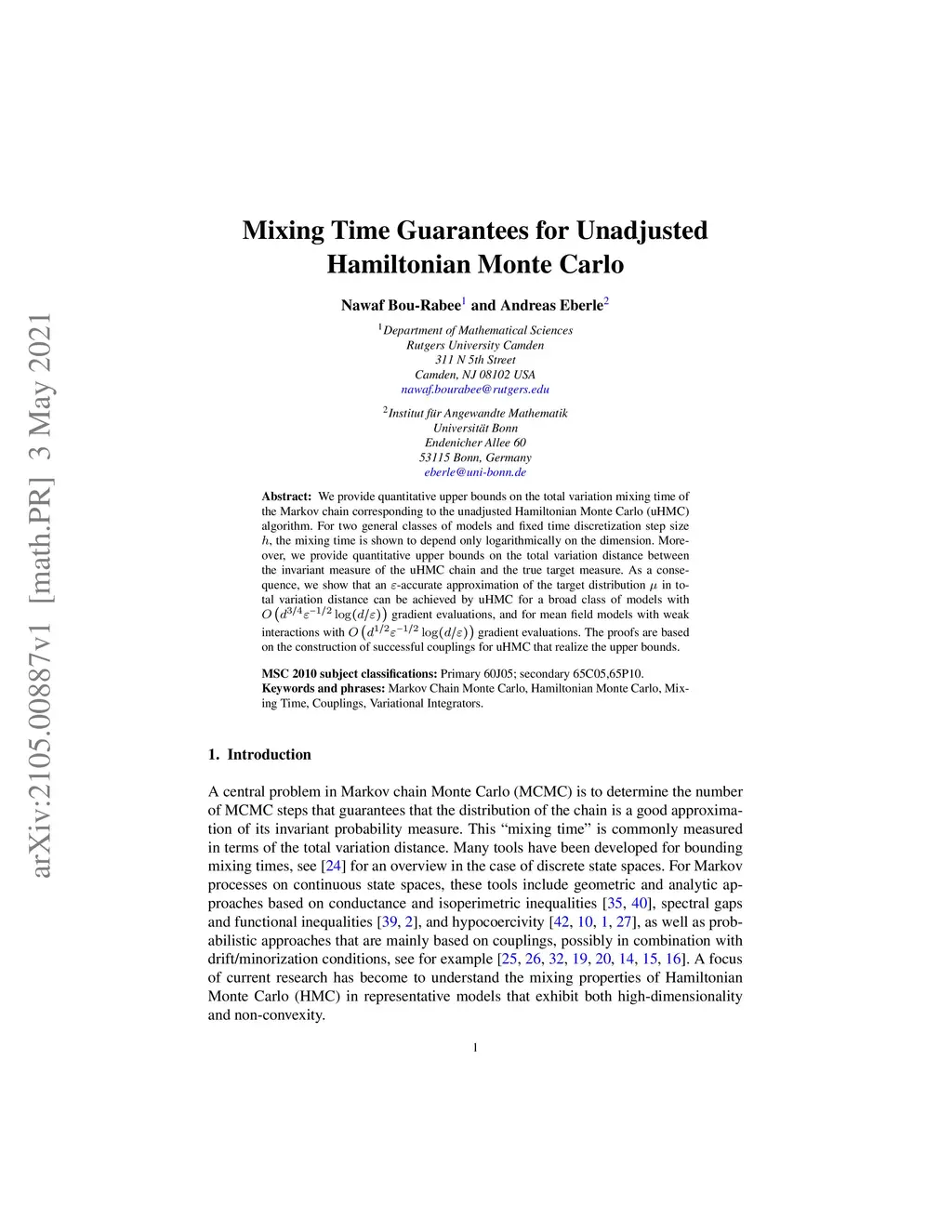 We provide quantitative upper bounds on the total variation mixing time of the Markov chain corresponding to the unadjusted Hamiltonian Monte Carlo (uHMC) algorithm. For two general classes of models and fixed time discretization step size , the mixing time is shown to depend only logarithmically on the dimension. Moreover, we provide quantitative upper bounds on the total variation distance between the invariant measure of the uHMC chain and the true target measure. As a consequence, we show that an -accurate approximation of the target distribution in total variation distance can be achieved by uHMC for a broad class of models with gradient evaluations, and for mean field models with weak interactions with gradient evaluations. The proofs are based on the construction of successful couplings for uHMC that realize the upper bounds.