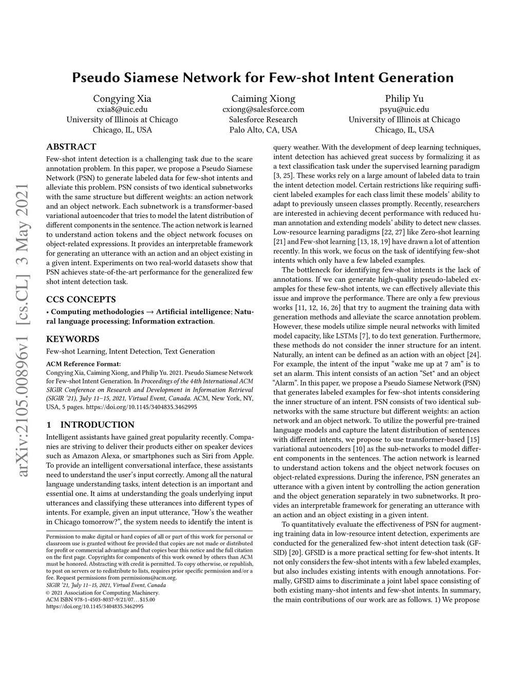 Few-shot intent detection is a challenging task due to the scare annotation problem. In this paper, we propose a Pseudo Siamese Network (PSN) to generate labeled data for few-shot intents and alleviate this problem. PSN consists of two identical subnetworks with the same structure but different weights: an action network and an object network. Each subnetwork is a transformer-based variational autoencoder that tries to model the latent distribution of different components in the sentence. The action network is learned to understand action tokens and the object network focuses on object-related expressions. It provides an interpretable framework for generating an utterance with an action and an object existing in a given intent. Experiments on two real-world datasets show that PSN achieves state-of-the-art performance for the generalized few shot intent detection task.