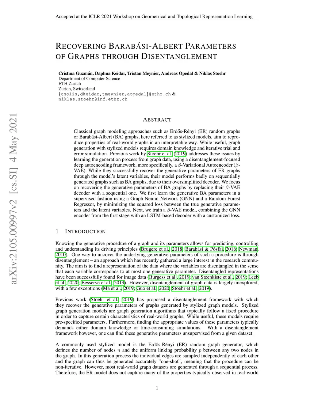 Classical graph modeling approaches such as Erd\H{o}s R\'{e}nyi (ER) random graphs or Barab\ási-Albert (BA) graphs, here referred to as stylized models, aim to reproduce properties of real-world graphs in an interpretable way. While useful, graph generation with stylized models requires domain knowledge and iterative trial and error simulation. Previous work by Stoehr et al. (2019) addresses these issues by learning the generation process from graph data, using a disentanglement-focused deep autoencoding framework, more specifically, a -Variational Autoencoder (-VAE). While they successfully recover the generative parameters of ER graphs through the model's latent variables, their model performs badly on sequentially generated graphs such as BA graphs, due to their oversimplified decoder. We focus on recovering the generative parameters of BA graphs by replacing their -VAE decoder with a sequential one. We first learn the generative BA parameters in a supervised fashion using a Graph Neural Network (GNN) and a Random Forest Regressor, by minimizing the squared loss between the true generative parameters and the latent variables. Next, we train a -VAE model, combining the GNN encoder from the first stage with an LSTM-based decoder with a customized loss.