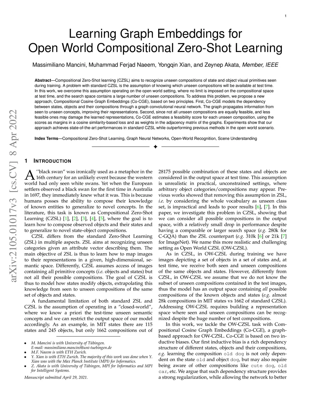 Compositional Zero-Shot learning (CZSL) aims to recognize unseen compositions of state and object visual primitives seen during training. A problem with standard CZSL is the assumption of knowing which unseen compositions will be available at test time. In this work, we overcome this assumption operating on the open world setting, where no limit is imposed on the compositional space at test time, and the search space contains a large number of unseen compositions. To address this problem, we propose a new approach, Compositional Cosine Graph Embeddings (Co-CGE), based on two principles. First, Co-CGE models the dependency between states, objects and their compositions through a graph convolutional neural network. The graph propagates information from seen to unseen concepts, improving their representations. Second, since not all unseen compositions are equally feasible, and less feasible ones may damage the learned representations, Co-CGE estimates a feasibility score for each unseen composition, using the scores as margins in a cosine similarity-based loss and as weights in the adjacency matrix of the graphs. Experiments show that our approach achieves state-of-the-art performances in standard CZSL while outperforming previous methods in the open world scenario.