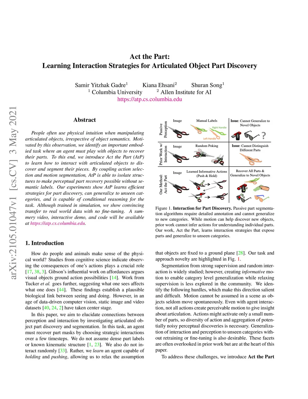 People often use physical intuition when manipulating articulated objects, irrespective of object semantics. Motivated by this observation, we identify an important embodied task where an agent must play with objects to recover their parts. To this end, we introduce Act the Part (AtP) to learn how to interact with articulated objects to discover and segment their pieces. By coupling action selection and motion segmentation, AtP is able to isolate structures to make perceptual part recovery possible without semantic labels. Our experiments show AtP learns efficient strategies for part discovery, can generalize to unseen categories, and is capable of conditional reasoning for the task. Although trained in simulation, we show convincing transfer to real world data with no fine-tuning.