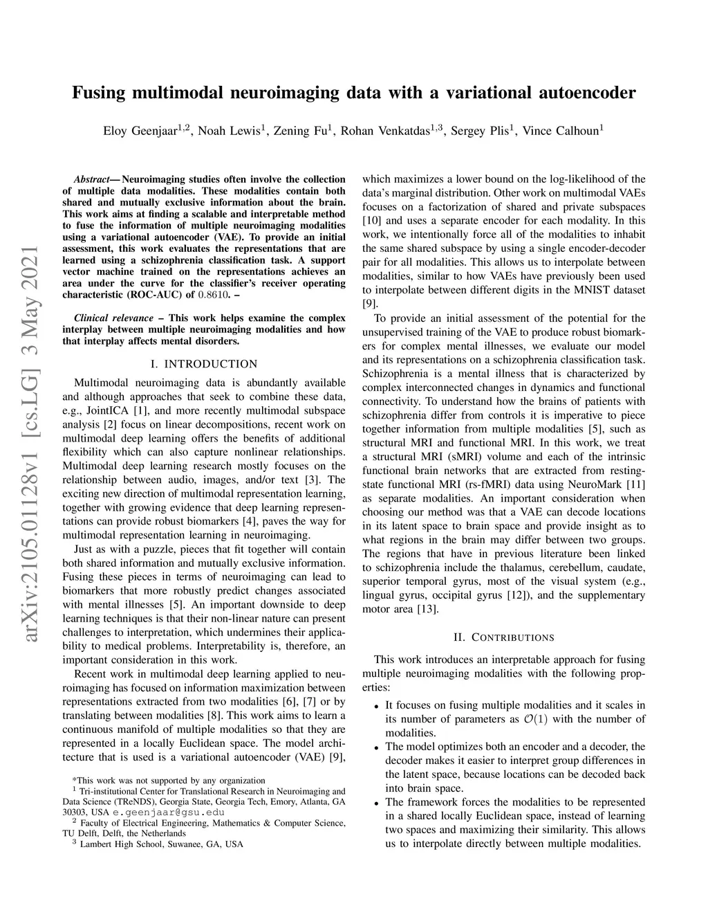 Neuroimaging studies often involve the collection of multiple data modalities. These modalities contain both shared and mutually exclusive information about the brain. This work aims at finding a scalable and interpretable method to fuse the information of multiple neuroimaging modalities using a variational autoencoder (VAE). To provide an initial assessment, this work evaluates the representations that are learned using a schizophrenia classification task. A support vector machine trained on the representations achieves an area under the curve for the classifier's receiver operating characteristic (ROC-AUC) of 0.8610.
