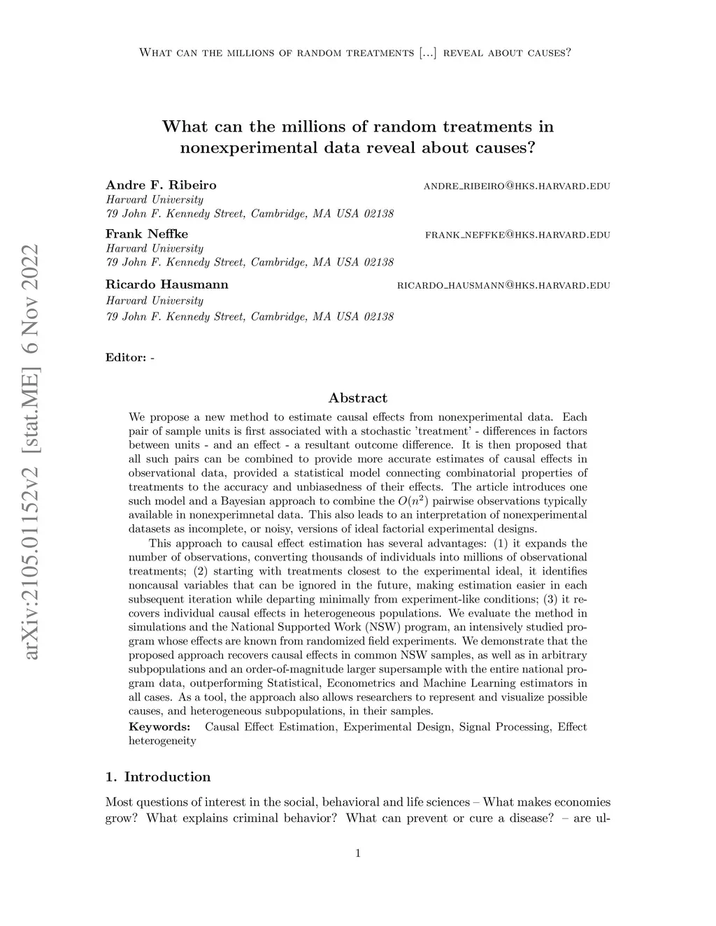 We propose a new method to estimate causal effects from nonexperimental data. Each pair of sample units is first associated with a stochastic 'treatment' - differences in factors between units - and an effect - a resultant outcome difference. It is then proposed that all such pairs can be combined to provide more accurate estimates of causal effects in observational data, provided a statistical model connecting combinatorial properties of treatments to the accuracy and unbiasedness of their effects. The article introduces one such model and a Bayesian approach to combine the pairwise observations typically available in nonexperimnetal data. This also leads to an interpretation of nonexperimental datasets as incomplete, or noisy, versions of ideal factorial experimental designs. This approach to causal effect estimation has several advantages: (1) it expands the number of observations, converting thousands of individuals into millions of observational treatments; (2) starting with treatments closest to the experimental ideal, it identifies noncausal variables that can be ignored in the future, making estimation easier in each subsequent iteration while departing minimally from experiment-like conditions; (3) it recovers individual causal effects in heterogeneous populations. We evaluate the method in simulations and the National Supported Work (NSW) program, an intensively studied program whose effects are known from randomized field experiments. We demonstrate that the proposed approach recovers causal effects in common NSW samples, as well as in arbitrary subpopulations and an order-of-magnitude larger supersample with the entire national program data, outperforming Statistical, Econometrics and Machine Learning estimators in all cases...