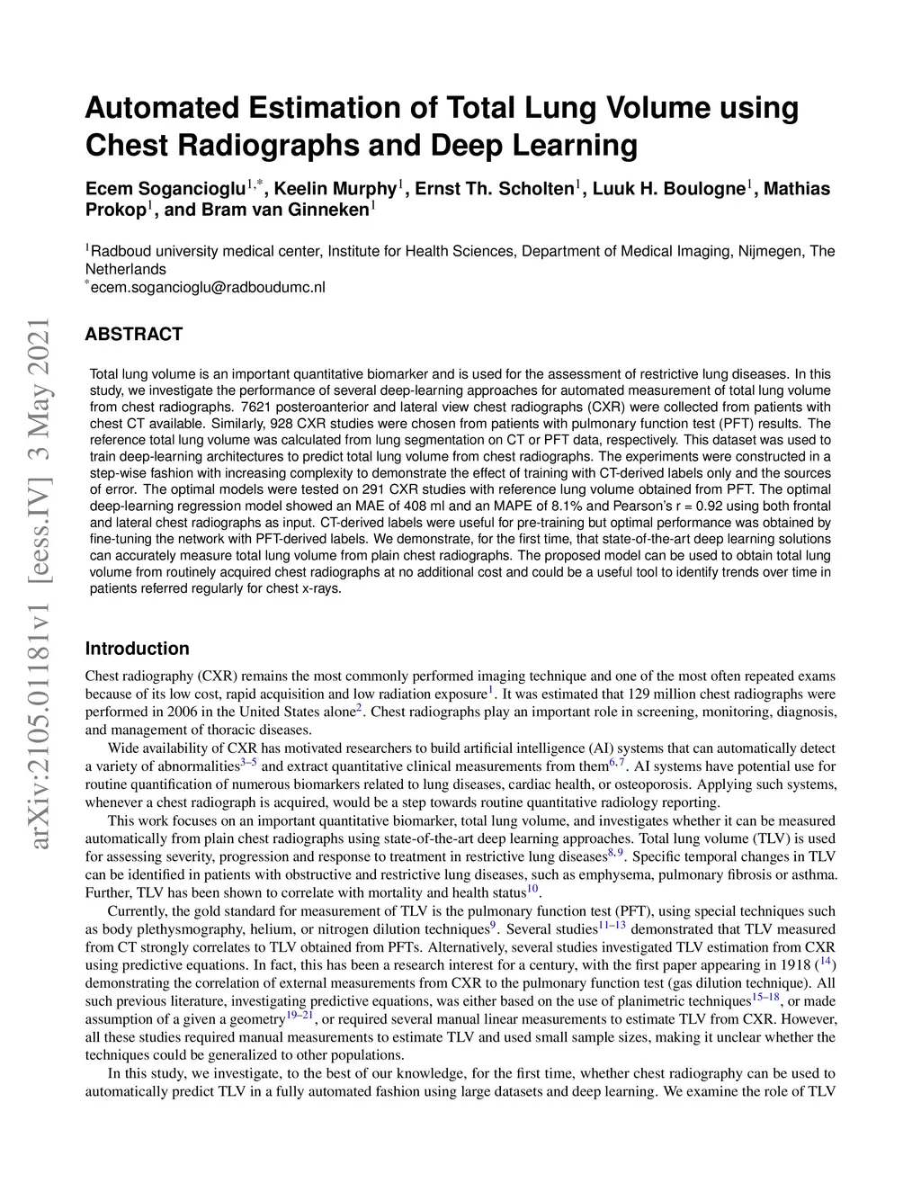 Automated Estimation of Total Lung Volume using Chest Radiographs and