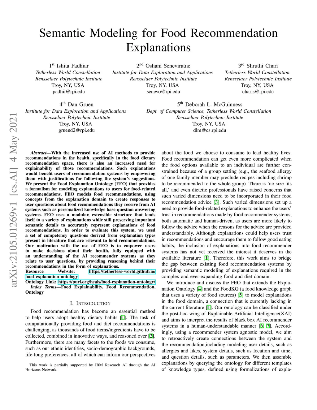 With the increased use of AI methods to provide recommendations in the health, specifically in the food dietary recommendation space, there is also an increased need for explainability of those recommendations. Such explanations would benefit users of recommendation systems by empowering them with justifications for following the system's suggestions. We present the Food Explanation Ontology (FEO) that provides a formalism for modeling explanations to users for food-related recommendations. FEO models food recommendations, using concepts from the explanation domain to create responses to user questions about food recommendations they receive from AI systems such as personalized knowledge base question answering systems. FEO uses a modular, extensible structure that lends itself to a variety of explanations while still preserving important semantic details to accurately represent explanations of food recommendations. In order to evaluate this system, we used a set of competency questions derived from explanation types present in literature that are relevant to food recommendations. Our motivation with the use of FEO is to empower users to make decisions about their health, fully equipped with an understanding of the AI recommender systems as they relate to user questions, by providing reasoning behind their recommendations in the form of explanations.