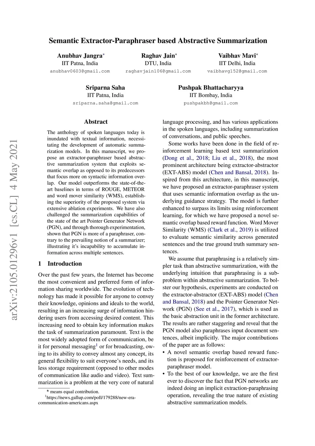 The anthology of spoken languages today is inundated with textual information, necessitating the development of automatic summarization models. In this manuscript, we propose an extractor-paraphraser based abstractive summarization system that exploits semantic overlap as opposed to its predecessors that focus more on syntactic information overlap. Our model outperforms the state-of-the-art baselines in terms of ROUGE, METEOR and word mover similarity (WMS), establishing the superiority of the proposed system via extensive ablation experiments. We have also challenged the summarization capabilities of the state of the art Pointer Generator Network (PGN), and through thorough experimentation, shown that PGN is more of a paraphraser, contrary to the prevailing notion of a summarizer; illustrating it's incapability to accumulate information across multiple sentences.