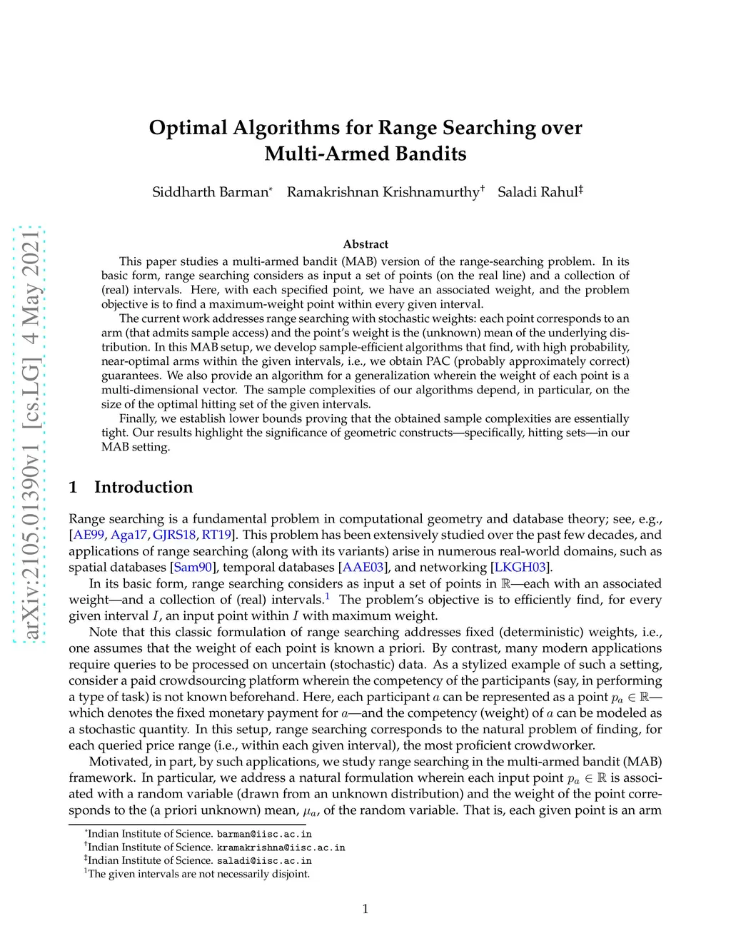 This paper studies a multi-armed bandit (MAB) version of the range-searching problem. In its basic form, range searching considers as input a set of points (on the real line) and a collection of (real) intervals. Here, with each specified point, we have an associated weight, and the problem objective is to find a maximum-weight point within every given interval. The current work addresses range searching with stochastic weights: each point corresponds to an arm (that admits sample access) and the point's weight is the (unknown) mean of the underlying distribution. In this MAB setup, we develop sample-efficient algorithms that find, with high probability, near-optimal arms within the given intervals, i.e., we obtain PAC (probably approximately correct) guarantees. We also provide an algorithm for a generalization wherein the weight of each point is a multi-dimensional vector. The sample complexities of our algorithms depend, in particular, on the size of the optimal hitting set of the given intervals. Finally, we establish lower bounds proving that the obtained sample complexities are essentially tight. Our results highlight the significance of geometric constructs -- specifically, hitting sets -- in our MAB setting.