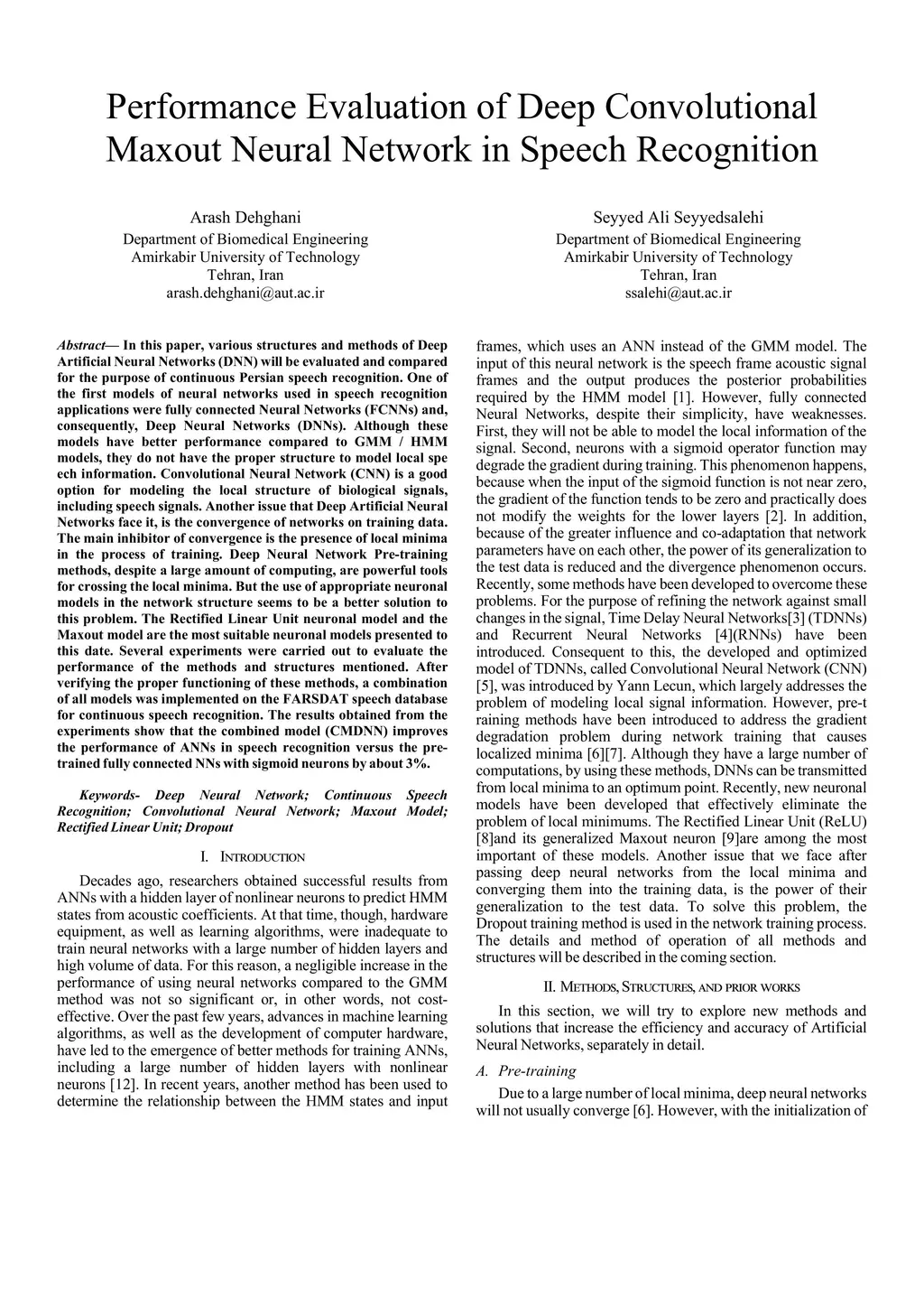 In this paper, various structures and methods of Deep Artificial Neural Networks (DNN) will be evaluated and compared for the purpose of continuous Persian speech recognition. One of the first models of neural networks used in speech recognition applications were fully connected Neural Networks (FCNNs) and, consequently, Deep Neural Networks (DNNs). Although these models have better performance compared to GMM / HMM models, they do not have the proper structure to model local speech information. Convolutional Neural Network (CNN) is a good option for modeling the local structure of biological signals, including speech signals. Another issue that Deep Artificial Neural Networks face, is the convergence of networks on training data. The main inhibitor of convergence is the presence of local minima in the process of training. Deep Neural Network Pre-training methods, despite a large amount of computing, are powerful tools for crossing the local minima. But the use of appropriate neuronal models in the network structure seems to be a better solution to this problem. The Rectified Linear Unit neuronal model and the Maxout model are the most suitable neuronal models presented to this date. Several experiments were carried out to evaluate the performance of the methods and structures mentioned. After verifying the proper functioning of these methods, a combination of all models was implemented on FARSDAT speech database for continuous speech recognition. The results obtained from the experiments show that the combined model (CMDNN) improves the performance of ANNs in speech recognition versus the pre-trained fully connected NNs with sigmoid neurons by about 3%.