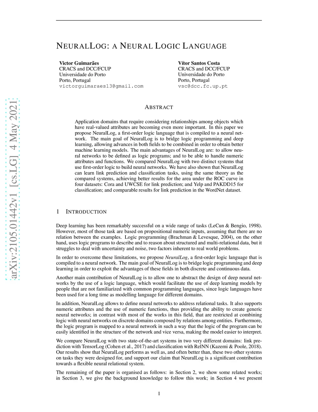 Application domains that require considering relationships among objects which have real-valued attributes are becoming even more important. In this paper we propose NeuralLog, a first-order logic language that is compiled to a neural network. The main goal of NeuralLog is to bridge logic programming and deep learning, allowing advances in both fields to be combined in order to obtain better machine learning models. The main advantages of NeuralLog are: to allow neural networks to be defined as logic programs; and to be able to handle numeric attributes and functions. We compared NeuralLog with two distinct systems that use first-order logic to build neural networks. We have also shown that NeuralLog can learn link prediction and classification tasks, using the same theory as the compared systems, achieving better results for the area under the ROC curve in four datasets: Cora and UWCSE for link prediction; and Yelp and PAKDD15 for classification; and comparable results for link prediction in the WordNet dataset.