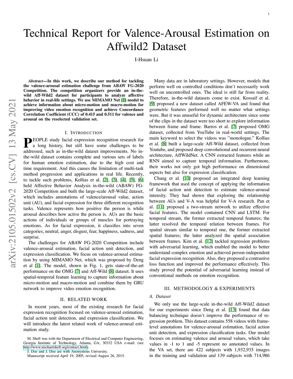In this work, we describe our method for tackling the valence-arousal estimation challenge from ABAW FG-2020 Competition. The competition organizers provide an in-the-wild Aff-Wild2 dataset for participants to analyze affective behavior in real-life settings. We use MIMAMO Net \cite{deng2020mimamo} model to achieve information about micro-motion and macro-motion for improving video emotion recognition and achieve Concordance Correlation Coefficient (CCC) of 0.415 and 0.511 for valence and arousal on the reselected validation set.