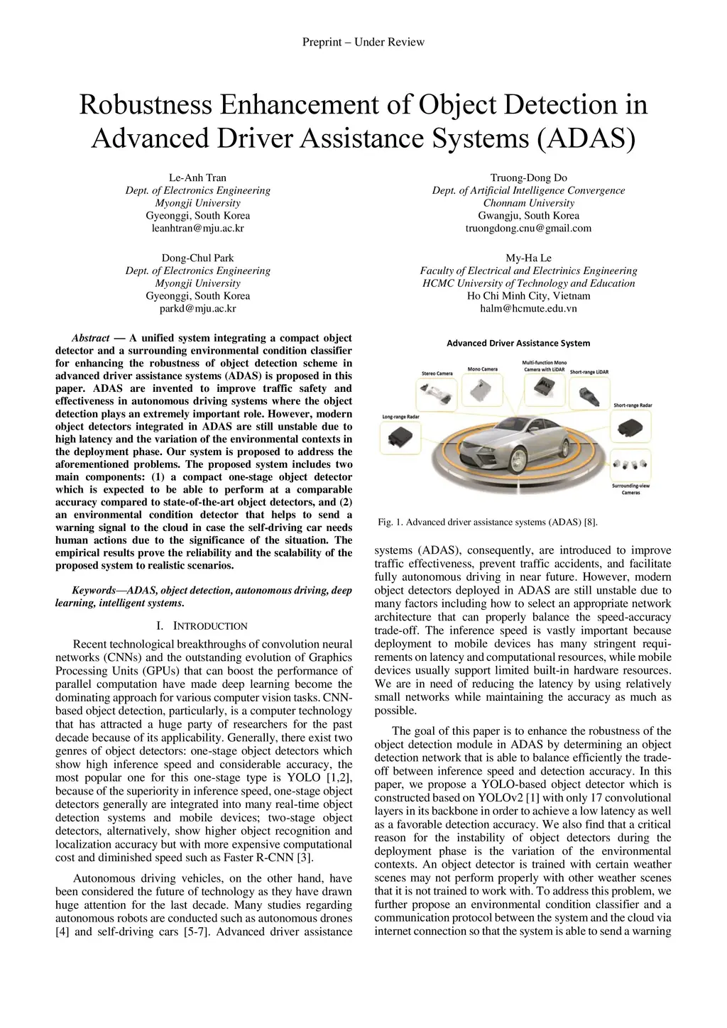 A unified system integrating a compact object detector and a surrounding environmental condition classifier for enhancing the robustness of object detection scheme in advanced driver assistance systems (ADAS) is proposed in this paper. ADAS are invented to improve traffic safety and effectiveness in autonomous driving systems where object detection plays an extremely important role. However, modern object detectors integrated in ADAS are still unstable due to high latency and the variation of the environmental contexts in the deployment phase. Our system is proposed to address the aforementioned problems. The proposed system includes two main components: (1) a compact one-stage object detector which is expected to be able to perform at a comparable accuracy compared to state-of-the-art object detectors, and (2) an environmental condition detector that helps to send a warning signal to the cloud in case the self-driving car needs human actions due to the significance of the situation. The empirical results prove the reliability and the scalability of the proposed system to realistic scenarios.
