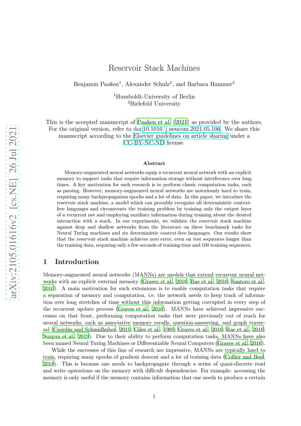 Memory-augmented neural networks equip a recurrent neural network with an explicit memory to support tasks that require information storage without interference over long times. A key motivation for such research is to perform classic computation tasks, such as parsing. However, memory-augmented neural networks are notoriously hard to train, requiring many backpropagation epochs and a lot of data. In this paper, we introduce the reservoir stack machine, a model which can provably recognize all deterministic context-free languages and circumvents the training problem by training only the output layer of a recurrent net and employing auxiliary information during training about the desired interaction with a stack. In our experiments, we validate the reservoir stack machine against deep and shallow networks from the literature on three benchmark tasks for Neural Turing machines and six deterministic context-free languages. Our results show that the reservoir stack machine achieves zero error, even on test sequences longer than the training data, requiring only a few seconds of training time and 100 training sequences.