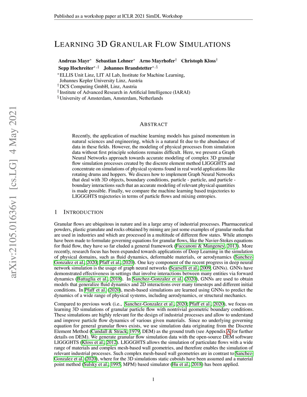 Recently, the application of machine learning models has gained momentum in natural sciences and engineering, which is a natural fit due to the abundance of data in these fields. However, the modeling of physical processes from simulation data without first principle solutions remains difficult. Here, we present a Graph Neural Networks approach towards accurate modeling of complex 3D granular flow simulation processes created by the discrete element method LIGGGHTS and concentrate on simulations of physical systems found in real world applications like rotating drums and hoppers. We discuss how to implement Graph Neural Networks that deal with 3D objects, boundary conditions, particle - particle, and particle - boundary interactions such that an accurate modeling of relevant physical quantities is made possible. Finally, we compare the machine learning based trajectories to LIGGGHTS trajectories in terms of particle flows and mixing entropies.
